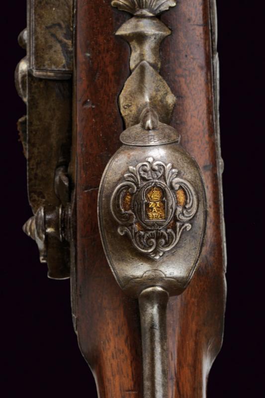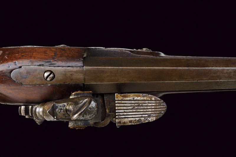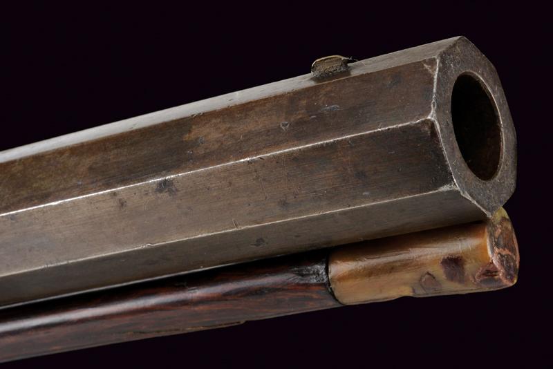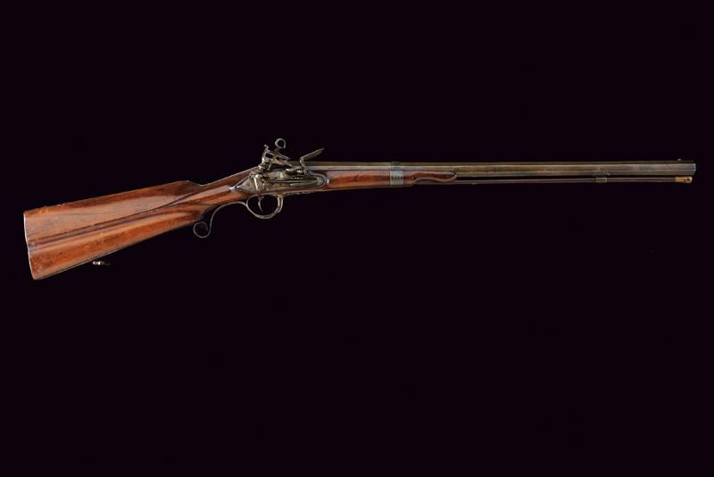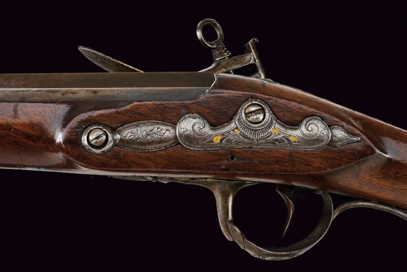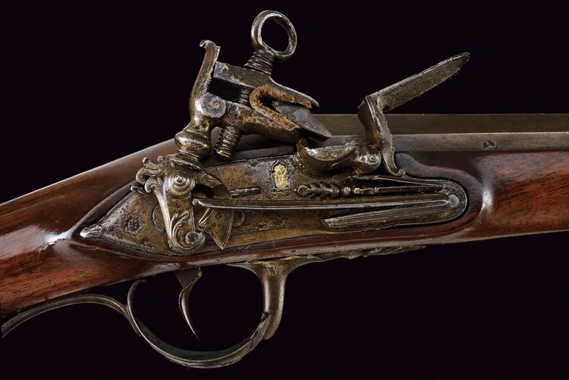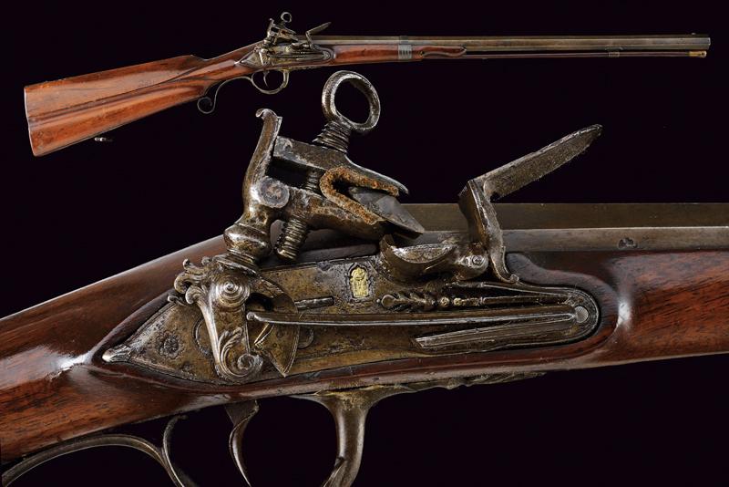 Fucile a pietra alla micheletta, datazione: 1800 circa provenienza: Italia o Spagna, Pesante canna ottagonale (tracce di rigatura all'interno?) dotata di mirino, cal. 15 mm. in volata. Batteria alla micheletta con meccanica funzionante, qualche intaccatura, al centro della cartella un punzone non chiaramente leggibile. Mezza cassa in legno. Bel ponticello in ferro con punzone dorato entro un fregio in rilievo. Il codolo anteriore a foglia. Il calciolo in ferro, lavorato en suite. Anche la contropiastra con fregi in rilievo e dorature. Bacchetta in legno con battipalla in corno. Probabilmente un fucile più lungo trasformato in carabina. lunghezza 106 cm.