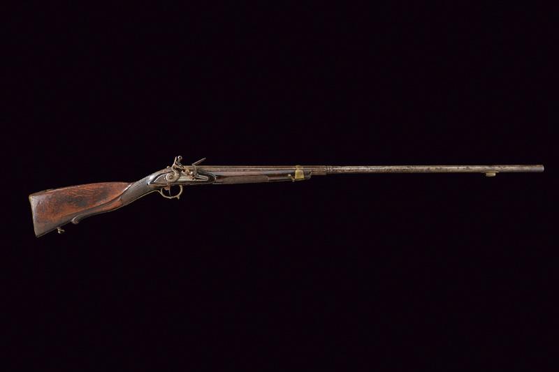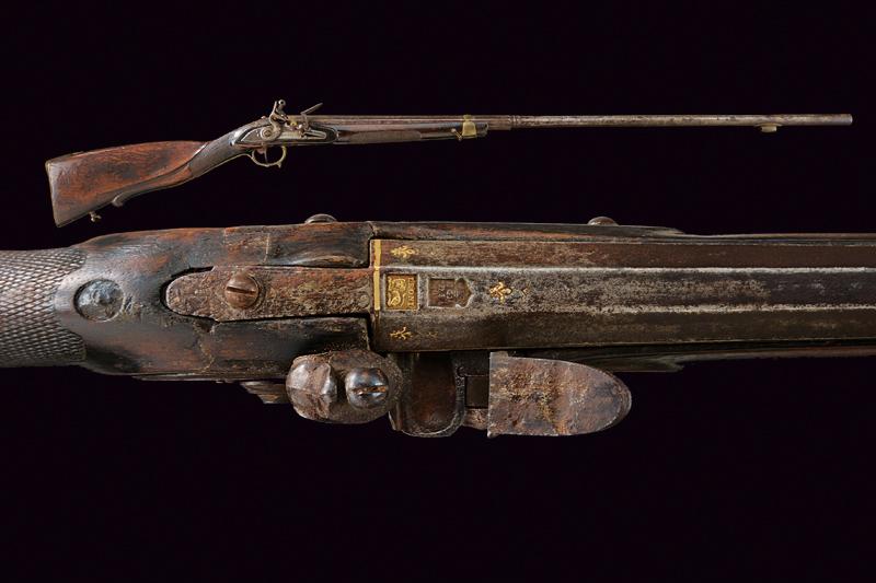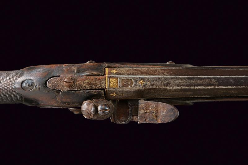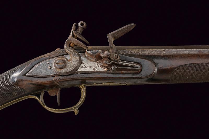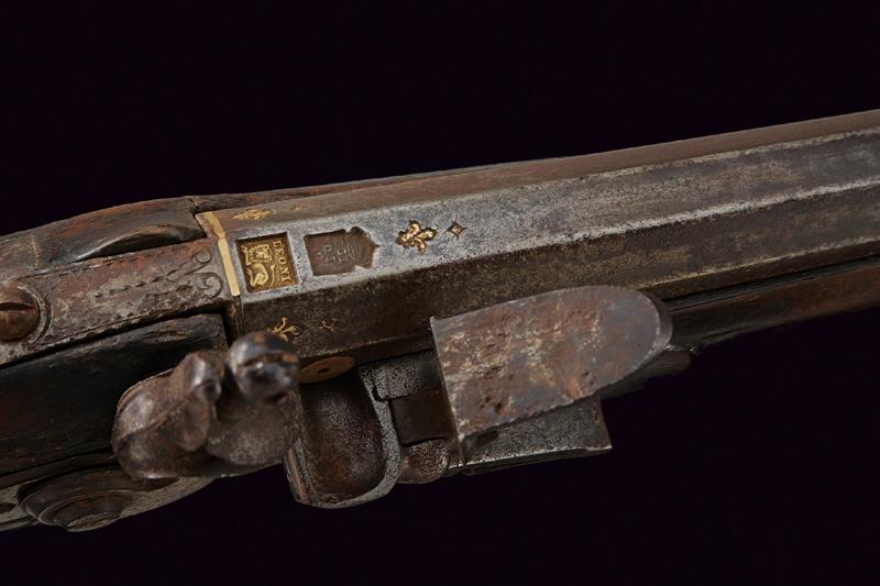 Fucile a pietra focaia, datazione: Prima metà del XIX Secolo provenienza: Italia settentrionale, Canna liscia a due ordini, la prima parte ottagonale con due punzoni fra gigli, 'EGIDIO' e 'LEONI', l'ultimo e i gigli foderati in oro, dopo un anello e foglie d'acanto tonda, il mirino mancante, rimaste le code di rondine e decorazioni in oro, cal. 15 mm; codetta incisa; batteria firmata 'Girolamo Ar....' munita di sistemi di antifrizione e tenuta stagna; focone foderato in oro. Mezza cassa in legno con poggiamano e collo zigrinati. Fornimenti in ottone. Bacchetta mancante. lunghezza 134 cm.