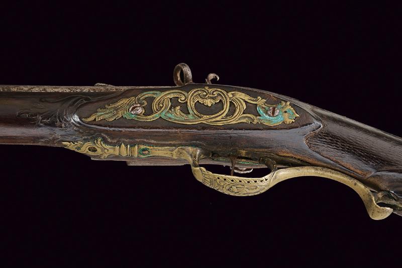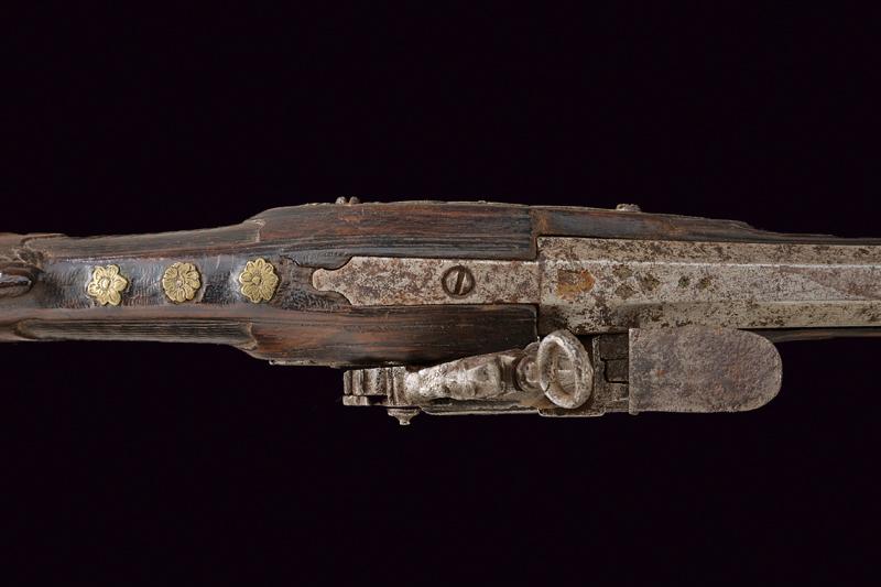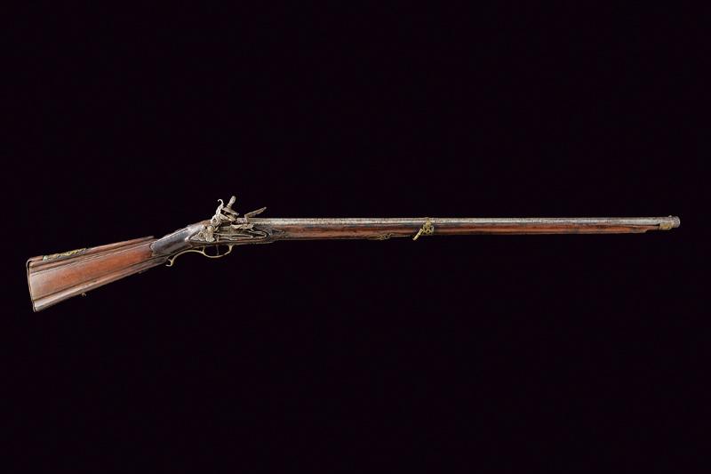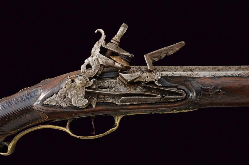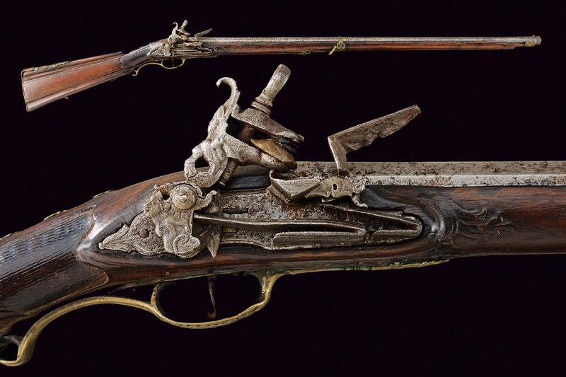 Fucile alla micheletta a pietra focaia, datazione: Seconda metà del XVIII secolo provenienza: Napoli, Canna liscia a due ordini, la base ottagonale con profonda marca 'FHS' sotto corona, tre gigli e due fiori, dopo un anello tonda e con mirino a coda di rondine, cal. 16 mm; bellissima batteria (molto stanca e danneggiata da ruggine) intagliato a figure sul cane, placca del cane e sulla martellina. Cassa intera in legno parzialmente intagliato a motivi floreali, il collo zigrinato e con calcio profondamente scanalato. Fornimenti in ottone inciso e traforato, sul collo tre fiori. Piccole mancanze e difetti, bacchetta mancante. Mentre si può sicuramente migliorare lo stato della canna, della cassa e degli fornimenti sara impossibile di portare di nuovo la bella batteria al suo splendore di due secoli fa. lunghezza 127 cm.