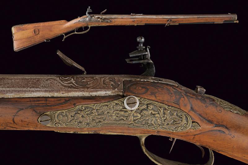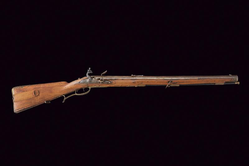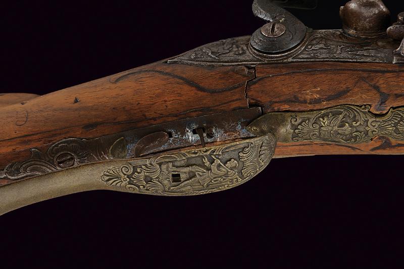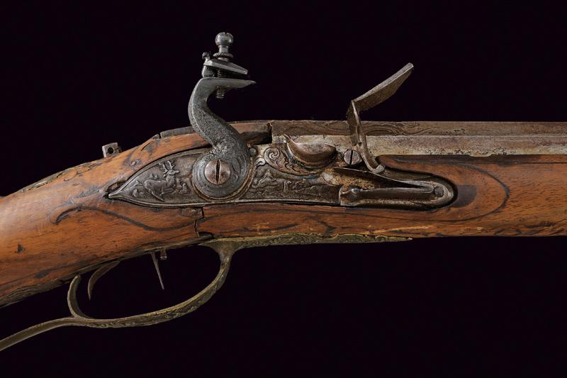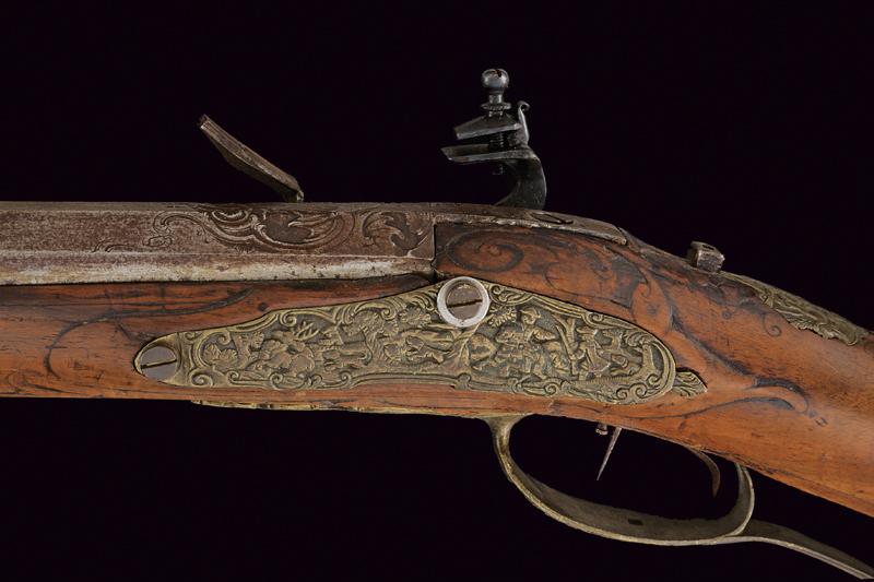 Interessante fucile a pietra focaia di Joseph Hauer, datazione: Prima metà del XVIII Secolo provenienza: Bamberg, Pesante canna rigata, ottagonale, la prima parte intagliata a motivi floreali in seguito firmata 'JOSEPH HAUER IN BAMBERG', munito di alzo e mirino, piccoli incisioni floreali, cal. 14.5 mm; codetta incisa; batteria a pietra focaia, la cartella intagliata a scene di caccia in bassorilievo, il cane probabilmente restaurato nella parte superiore. Cassa intera in legno, leggermente scolpito, con rottura sotto il ponticello. Patchbox. Bellissimi fornimenti in ottone decorato con scene di caccia in bassorilievo. Stecher. Bacchetta di ricambio. In patina. Merita sicuramente un restauro adeguato. lunghezza 103.5 cm.