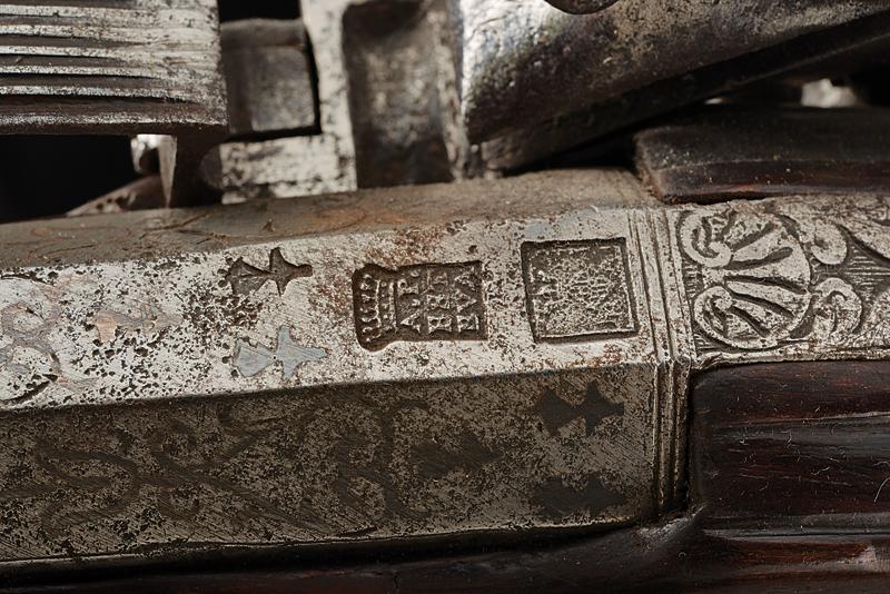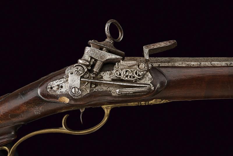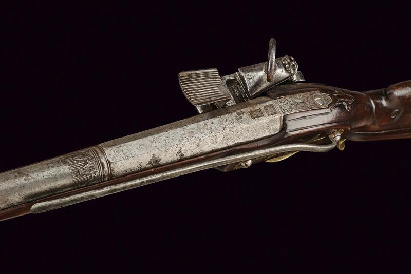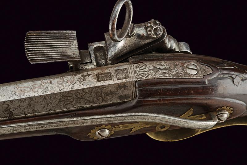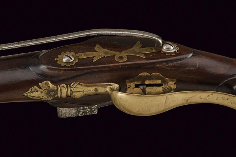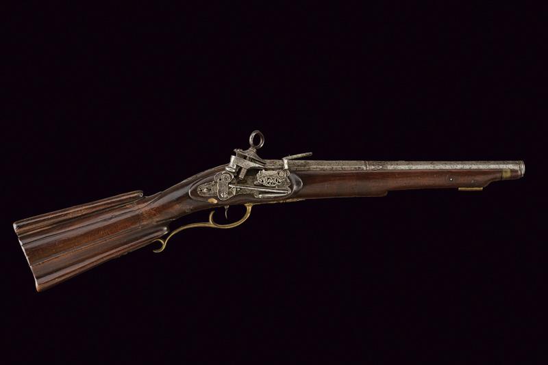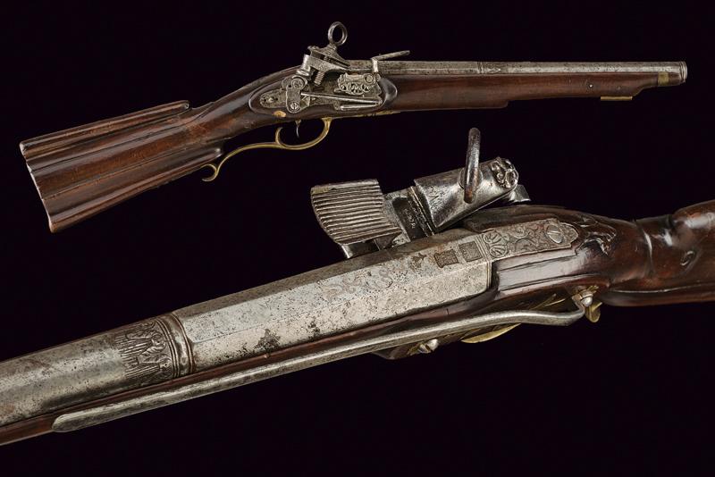 Fucile corto alla micheletta a pietra focaia, datazione: XVIII Secolo provenienza: Napoli o Spagna, Canna liscia a due ordini, la prima parte ottagonale con due punzoni di A. Pedro Esteva (Stöckel 328/329) fra piccoli punzoni e decorazioni con resti d'argento, dopo un anello e foglia d'acanto tonda e con gioia di bocca, cal. 16 mm; codetta riccamente incisa; batteria alla micheletta parzialmente incisa, intagliata e traforata, la martellina con effige di un soldato con elmo. Cassa intera in legno con calcio scanalato, fornimenti lisci in ottone. Bacchetta mancante. Gancio da cintura in ferro. lunghezza 60.5 cm.