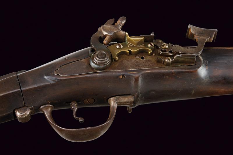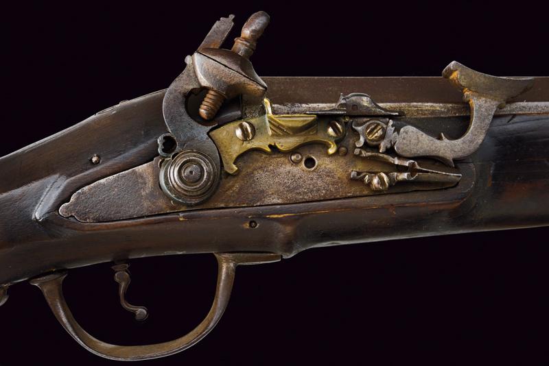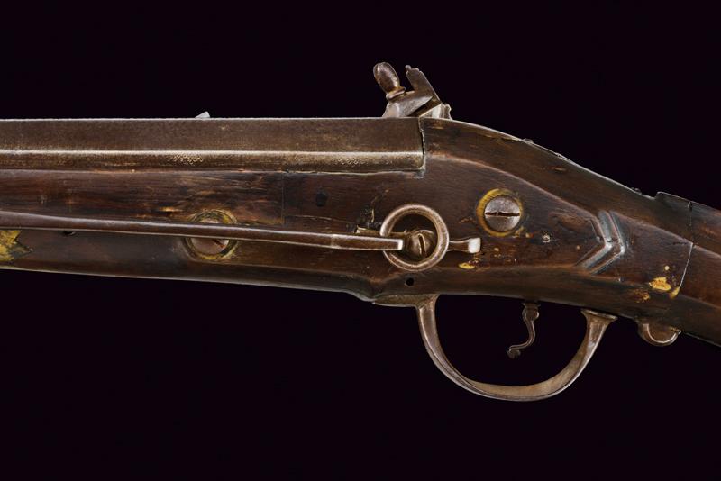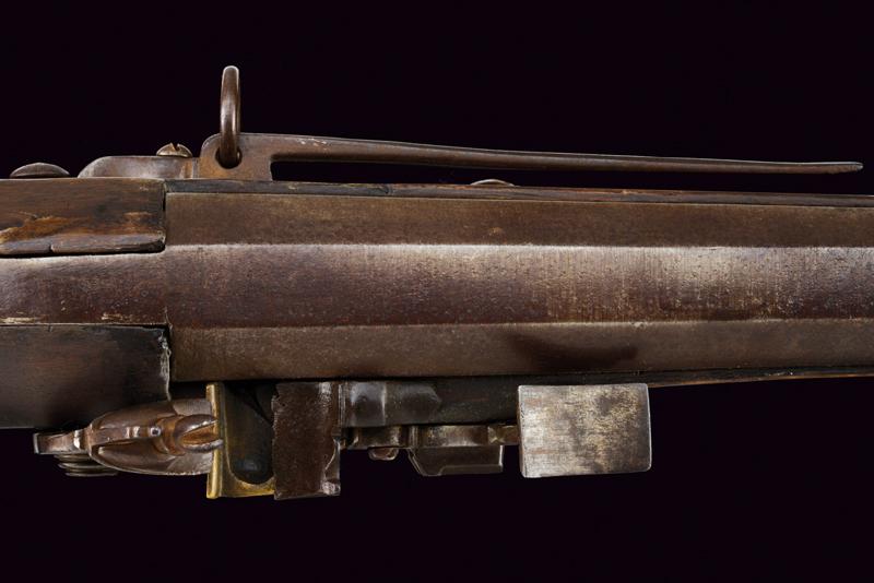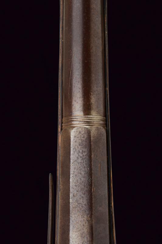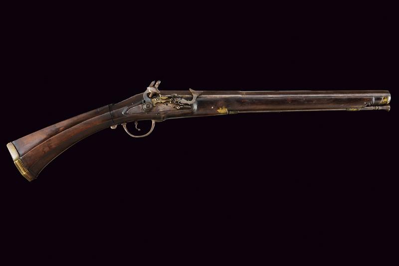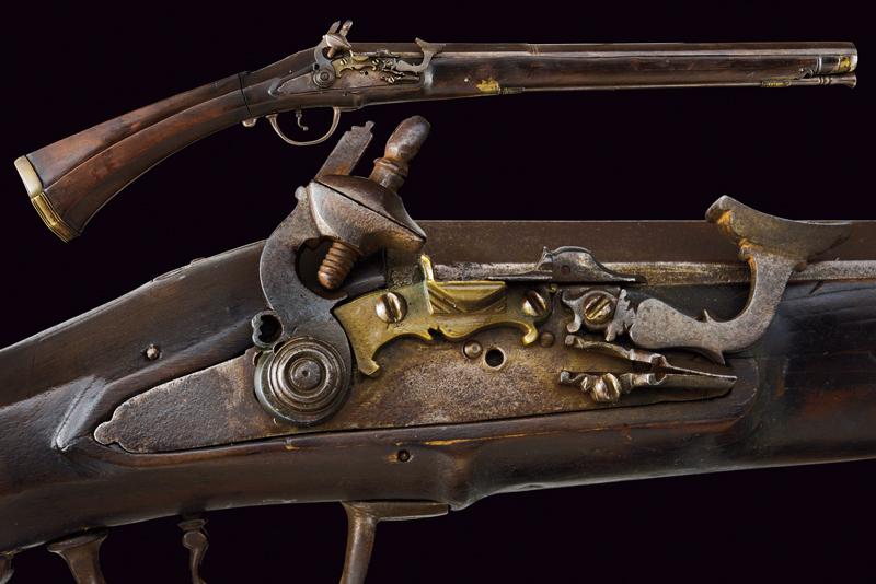 Scavezzo alla pietra focaia alla fiorentina, datazione: 1700 circa provenienza: Toscana, Canna liscia a due ordini, prima ottagonale poi tonda con anelli al cambio, cal. 22 mm (!). Batteria all fiorentina a pietra focaia con copriscodellino scorrevole e cartella piatta. Cassa intera con restauri nella parte della canna, calcio faccettato e pieghevole, sul dorso un bottone d'apertura. Ponticello in ferro, fornimenti in ottone. Gancio di cintura in ferro munito di anello per la sella. Bacchetta in ferro. lunghezza 84 cm.