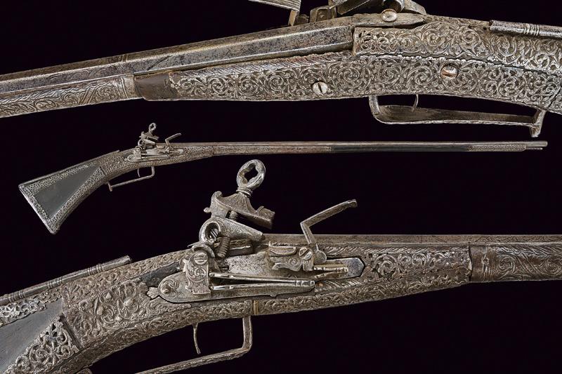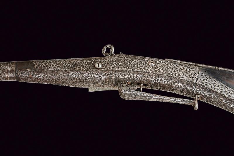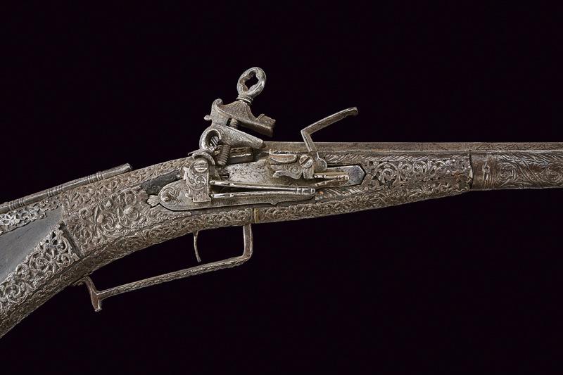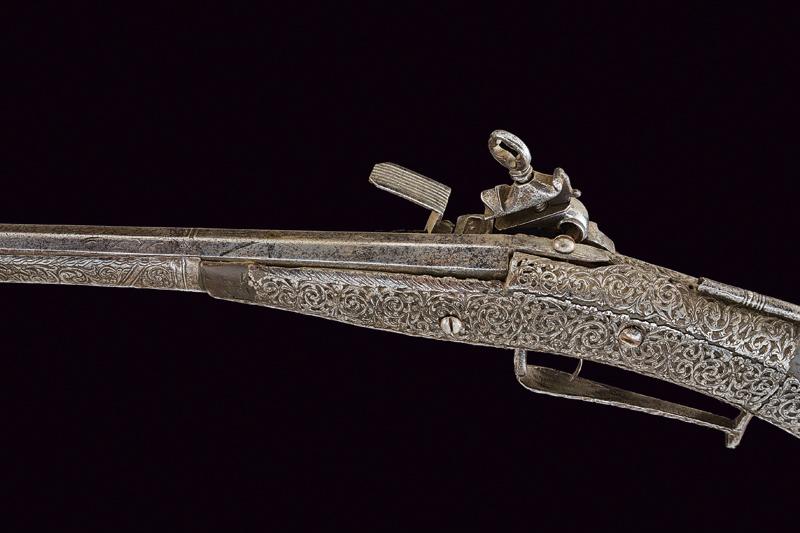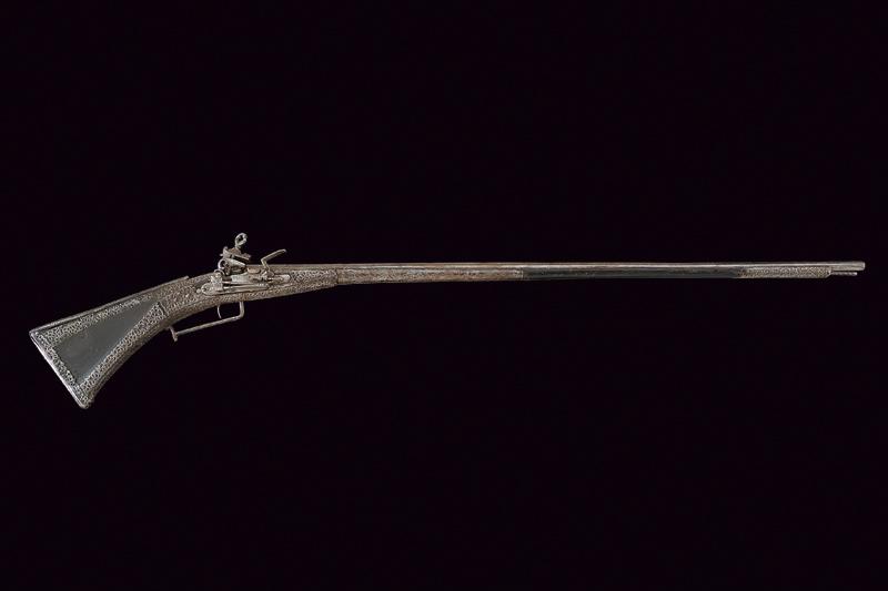 Fucile a pietra focaia alla micheletta di Barbuti, datazione: XVIII Secolo provenienza: Sardegna, Canna ottagonale, liscia, marcata 'FRANZINI' e decorata a incisioni e piccoli intarsi in ottone alla base, cal. 11 mm; batteria intagliata ed incisa firmata 'Barbuti' sotto la molla. Mezza cassa in legno parzialmente ricoperta con placche in ferro, riccamente incise e traforate a motivi floreali, piccole mancanze. Ponticello in ferro intagliato con una figura. Bacchetta in ferro. lunghezza 132 cm.