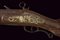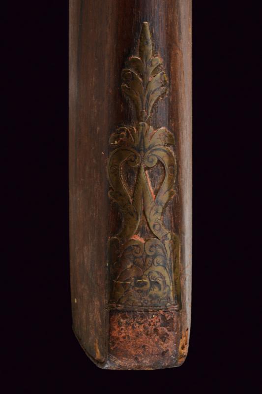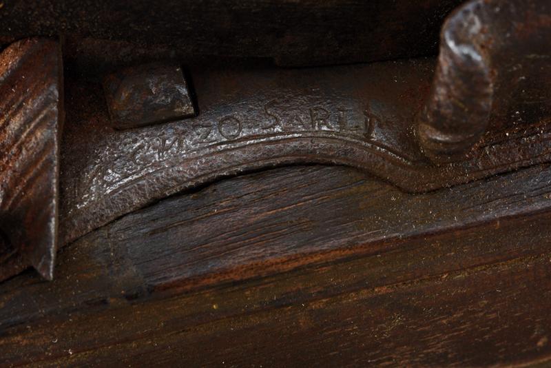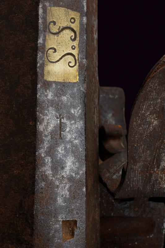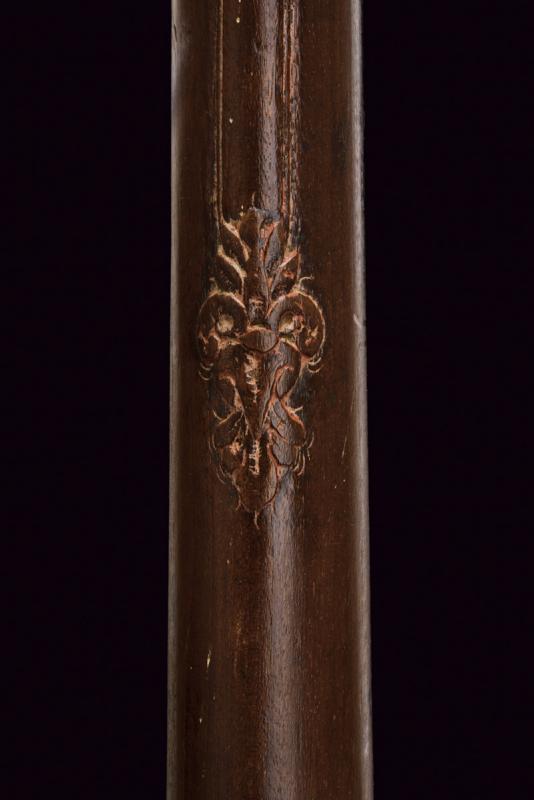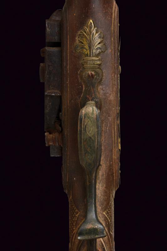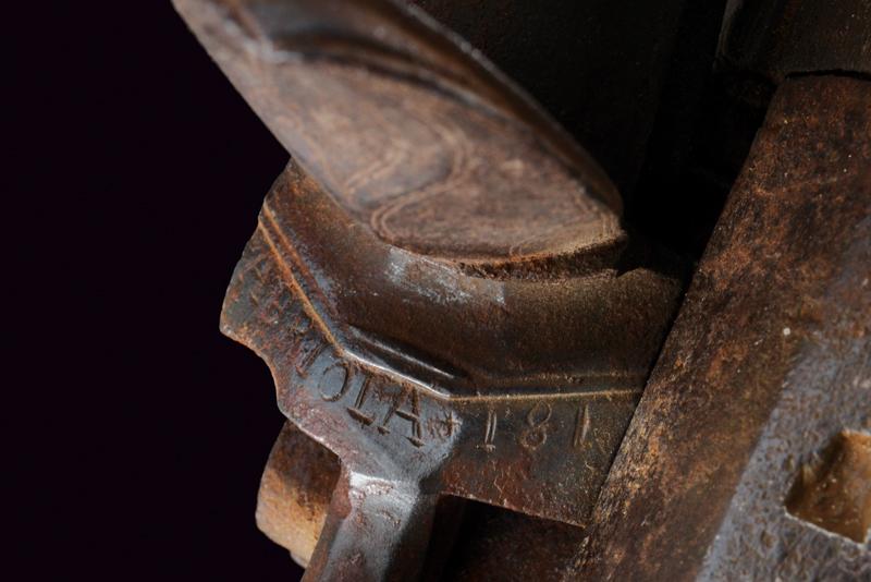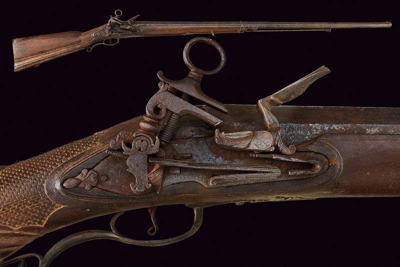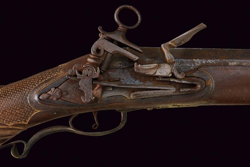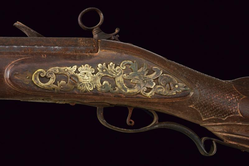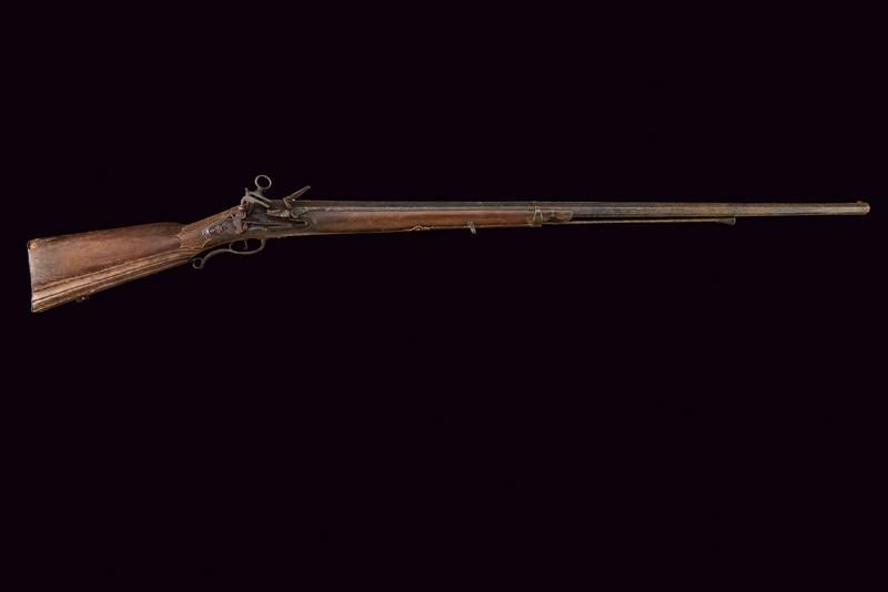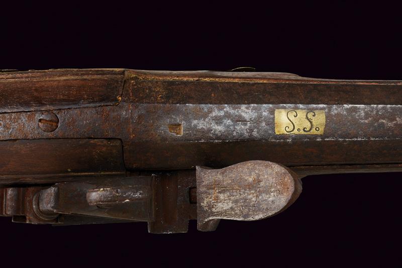 Rara spingarda alla micheletta a pietra focaia, datazione: Fine XVIII inizio XIX Secolo provenienza: Napoli, Lunga e pesante canna liscia, ottagonale, la base con resti di un puntone profondo, resti di una 'P' (?) sotto una piccola croce e monogramma 'S.S.' foderato in ottone, mirino in ferro, cal. 20 mm; bella batteria alla micheletta intagliata ed incisa a motivi floreali, in basso resti di una firma '...NZO SARLI'. Al dorso del copriscodellino resti di marcatura 'ABRIOLA 181...' Mezza cassa in legno (piccoli danni e mancanze) leggermente scolpito, zigrinato a squame sul collo e con scanalatura al calcio. Fornimenti in ottone inciso e parzialmente traforato, la contropiastra con mascherone. Bacchetta in ferro. Interessante arma di un certo pregio, con patina scura, sicuramente ben restaurabile. lunghezza 158.5 cm.