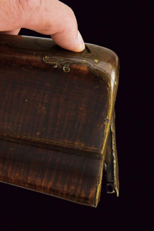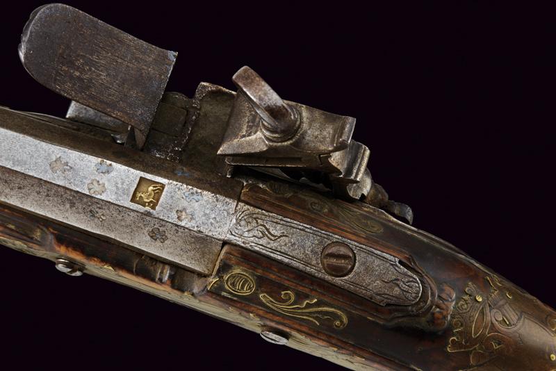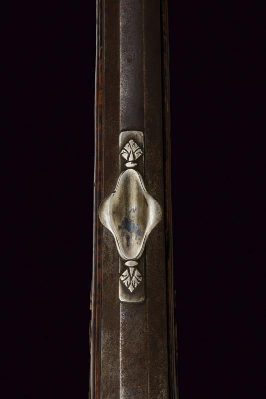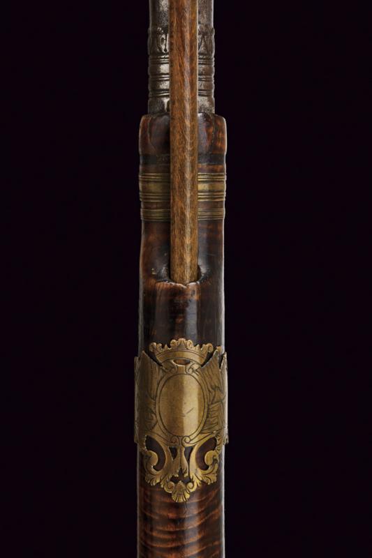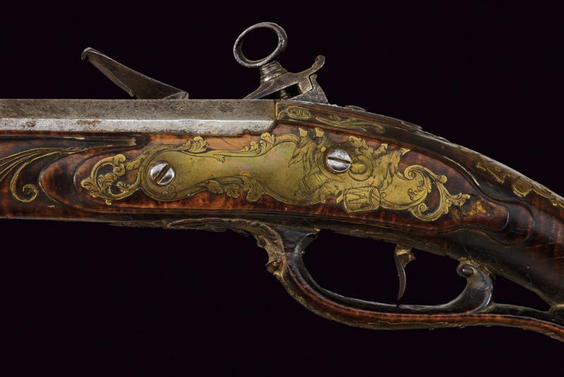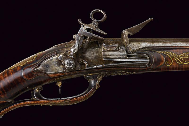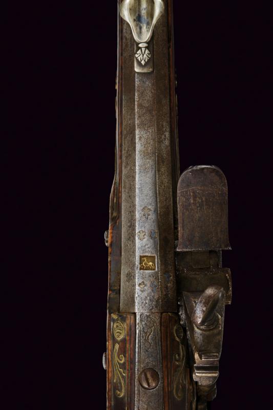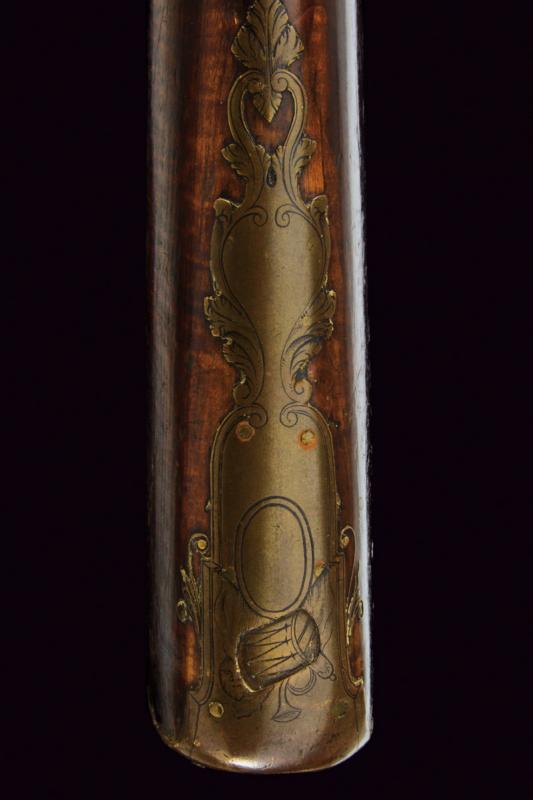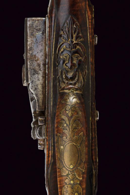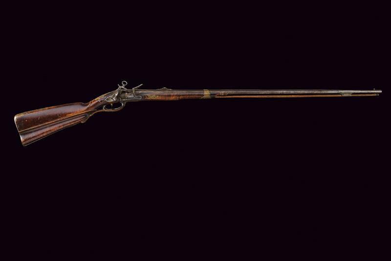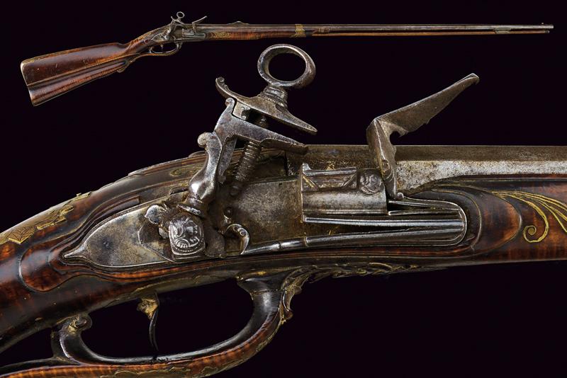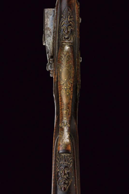 Interessante fucile a pietra focaia alla romana del maestro 'AS', datazione: Seconda metà del XVIII secolo provenienza: Italia centrale, Lunga canna liscia a due ordini, la prima parte ottagonale con marcatura rimessa in ottone tra gigli, bel alzo a sella in argento, dopo due anelli e foglie d'acanto tonda e con mirino a coda di rondine in argento, cal. 14 mm; codetta incisa; batteria alla romana, le viti del cane e della martellina ricoperto con medaglioni recante un busto intagliato. All'interno marcato 'AS' intrecciato. Mezza cassa in bel legno venato, con calcio scanalato, ponticello in legno con parte anteriore e posteriore decorato con due mascheroni scolpiti in bassorilievo, uno con faccia sorridente, l'altro con faccia arrabbiata. Belli fornimenti ed intarsi in ottone decorato con trofei e motivi floreali, scudetto sotto corona sul dorso e nella parte inferiore del reggicanna, la coccia con bottone, nascosto sotto un tamburo che apre uno sportellino (che porta il monogramma del proprietario) per una baionetta a ghiera, ora mancante. Bacchetta in legno con battipalla in corno e cavastracci in ferro. Piccolissimi difetti e mancanze. In patina. lunghezza 154 cm.