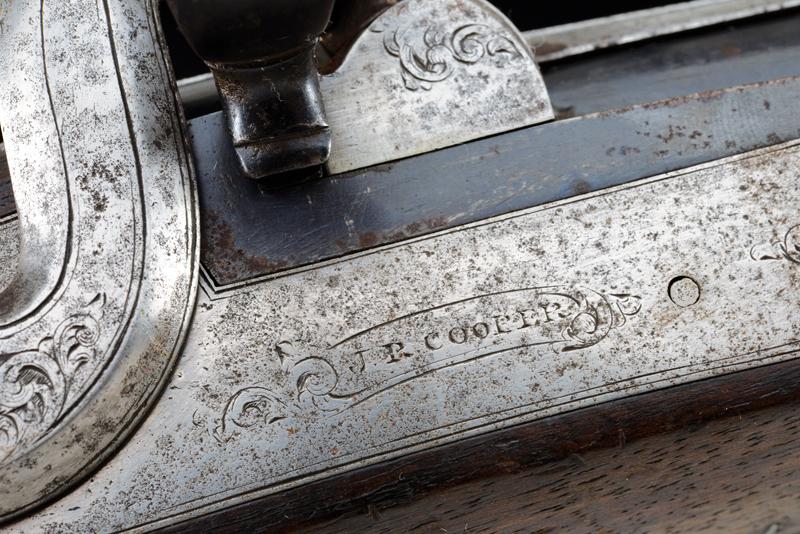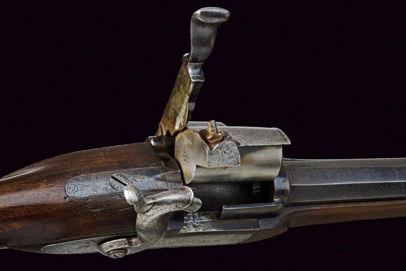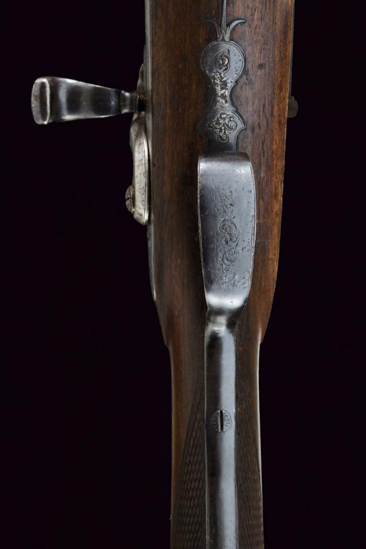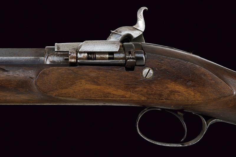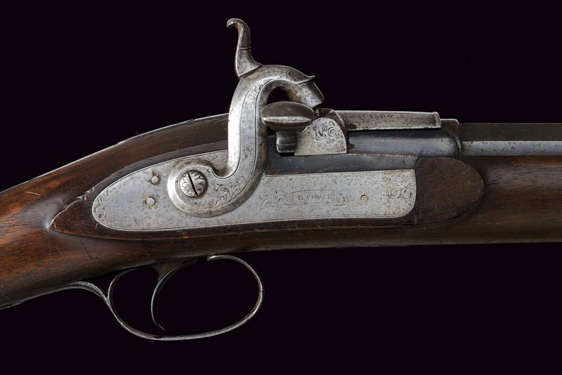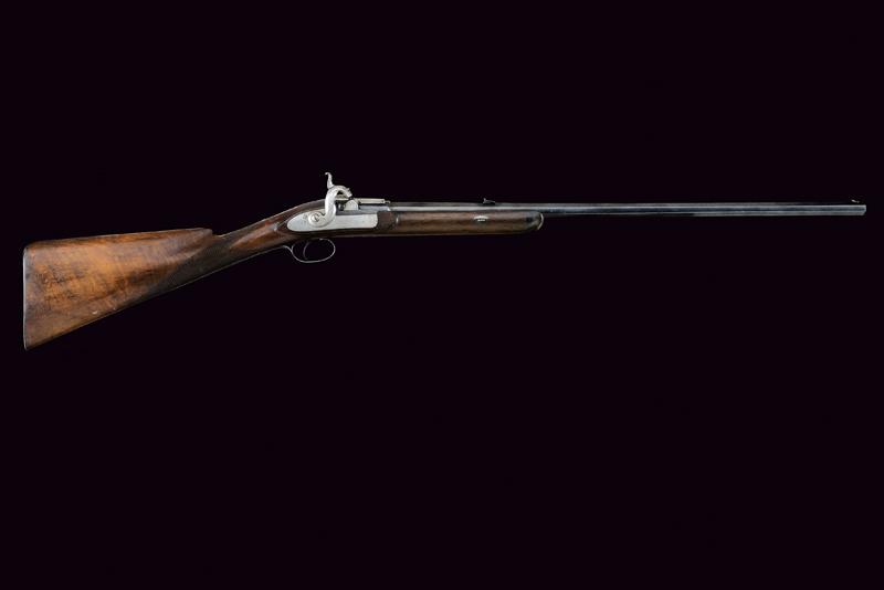 Raro fucile a luminello a retrocarica di C. R. Cooper, datazione: 1860 circa provenienza: Inghilterra, Canna rigata, ottagonale, brunita (leggero pitting) con alzo variabile, mirino, cal. 28; otturatore apribile marcato 'J. R. COOPER'S PATENT BREECH LOADING No. 56', codetta brunita, incisa e con traguardo; batteria a molla in avanti firmata ''J. R. COOPER' e con fini incisioni floreali. Mezza cassa in legno con collo zigrinato. Fornimenti in ferro decorati en suite. lunghezza 115 cm.