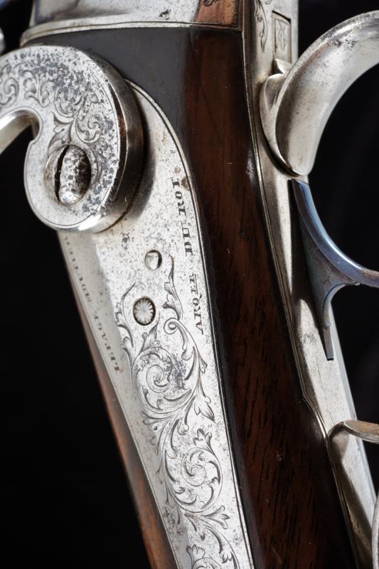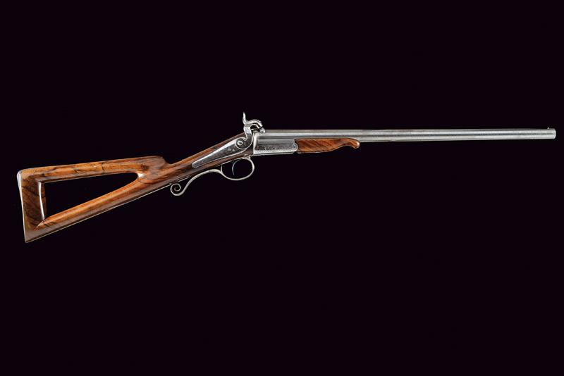 Raro fucile a luminello a retrocarica di Lepage Moutier, datazione: Terzo quarto del XIX Secolo provenienza: Francia, Canna tonda liscia in damasco con mirino, dorso piatto alla base con la firma in oro in rilievo 'Le Page Moutier Arq.er du Roi', in volata cal. 16 mm. Pistone dorsale sul fianco destro. La canna bascula in avanti, lo sblocco è tramite leva al codolo posteriore del ponticello. Lungo codolo inciso a racemi e dotato di breve traguardo a sella. Batteria a molla indietro incisa a racemi e firmata 'LEPAGE MOUTIER / ARQ.ER DU ROI'. Calcio a scheletro ed astina in radica. Il calciolo in ferro, con incisioni en suite alla batteria. Ponticello a leva con codolo a ricciolo, anche questo inciso, come anche la bascula, a racemi. lunghezza 90,4 cm.