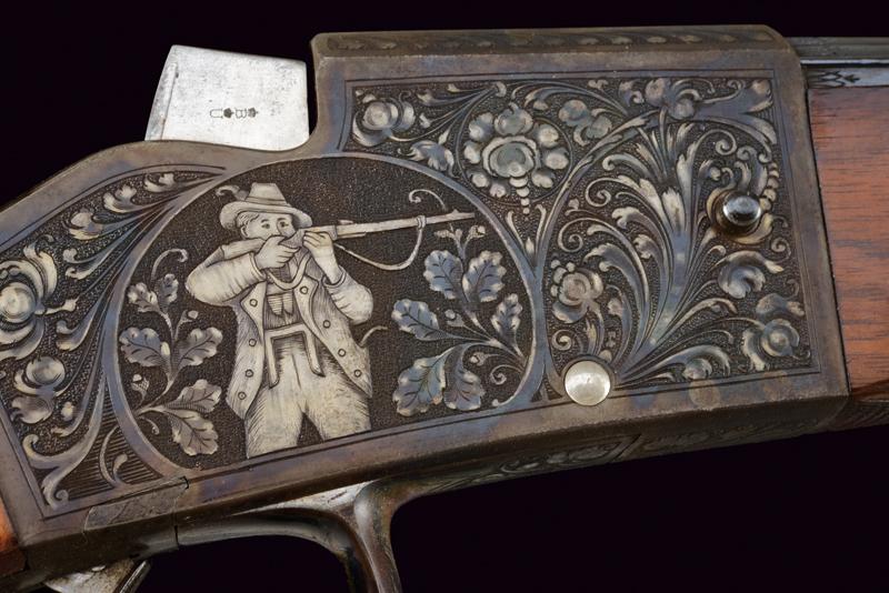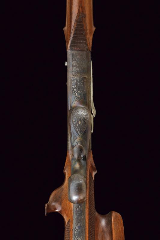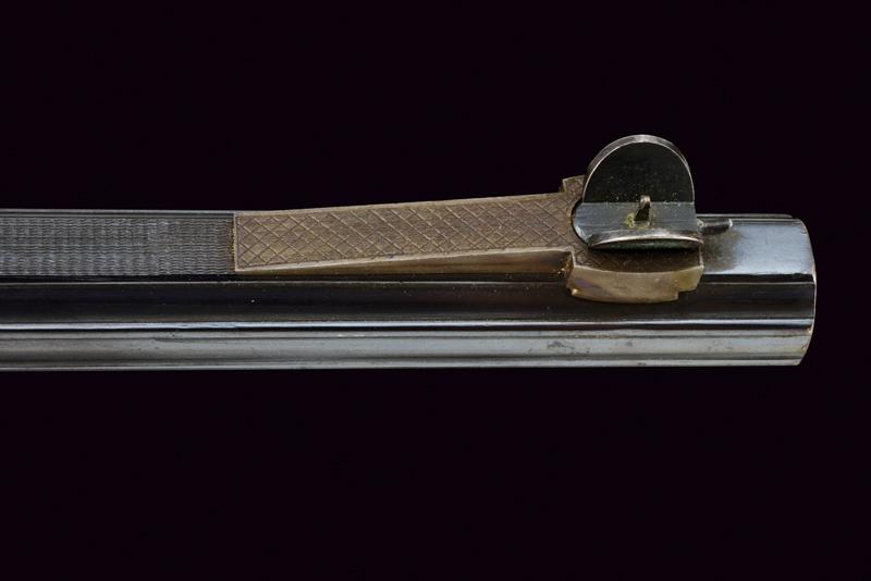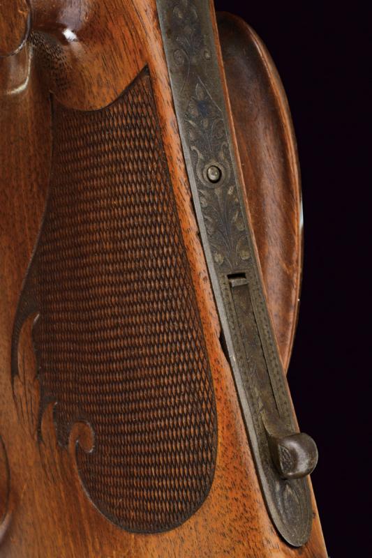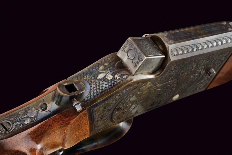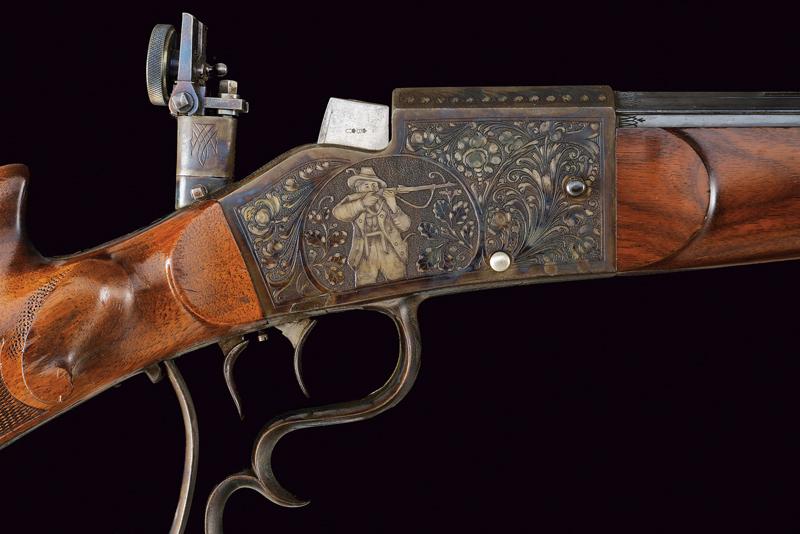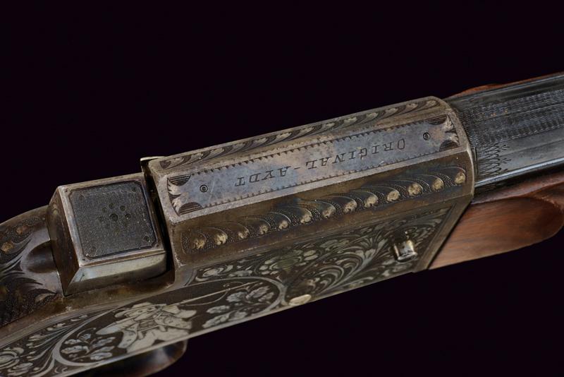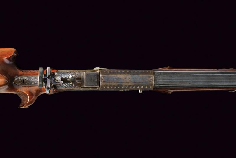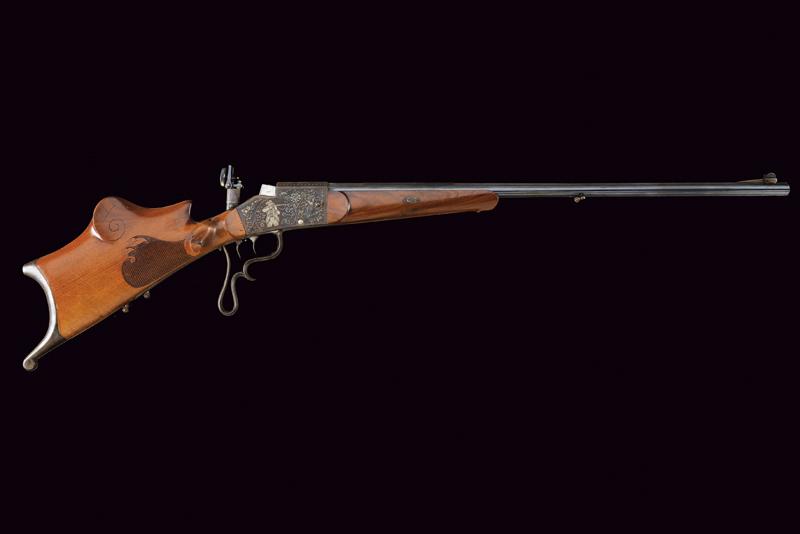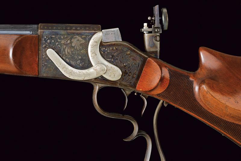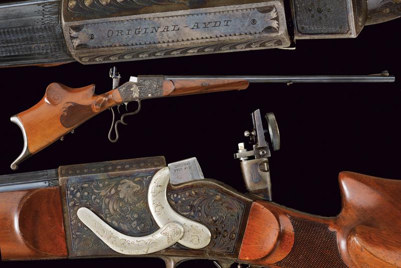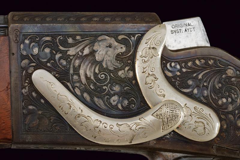 Bellissima carabina falling block da tiro con sistema Aydt, datazione: 1870 - 1880 circa provenienza: Suhl, Canna rigata, con bindella zigrinata e decorata a nervature, incisa alla base, con mirino di precisione, cal. 8 mm; castello con bellissime incisioni raffiguranti un tiratore e un animale grottesco fra motivi floreali su fondo granulato, sopra marcato 'ORIGINAL AYDT', il blocco marcato 'ORIGINAL SYST. AYDT'. Cassa in legno in due pezzi con collo zigrinato e guancia fortemente pronunciata. Fornimenti in ferro con ponticello a leva. Stecher. Diottra regolabile. Raro. Per Carl Wilhelm Aydt vedi 'Der Neue Stöckel', Vol. I, pag. 38. Aydt costruisce il suo primo sistema Falling Block già nel 1865. lunghezza 124 cm.