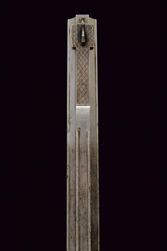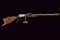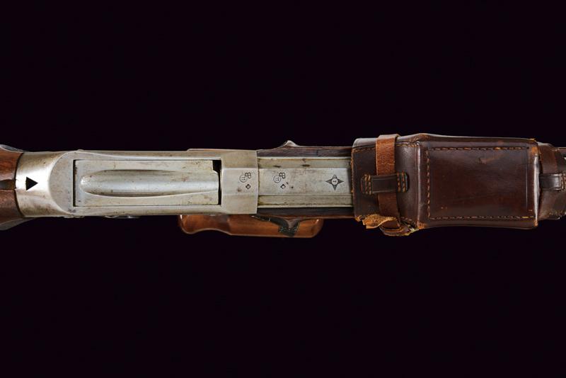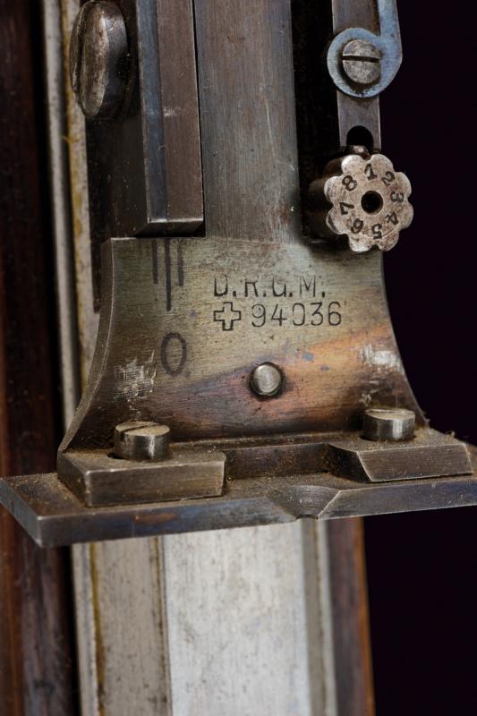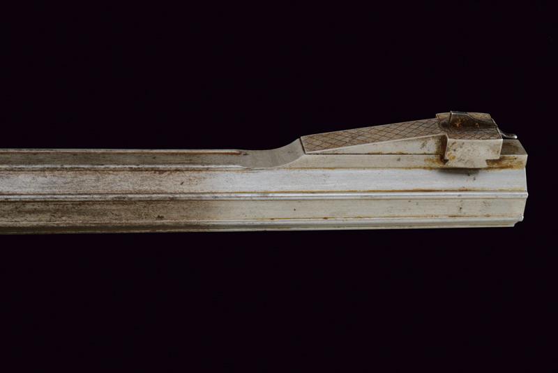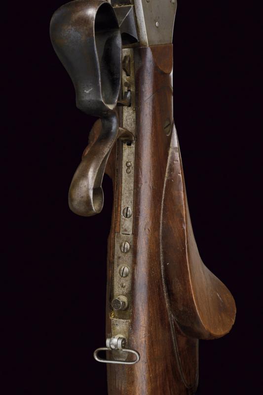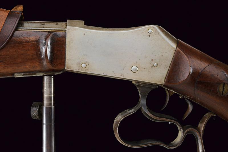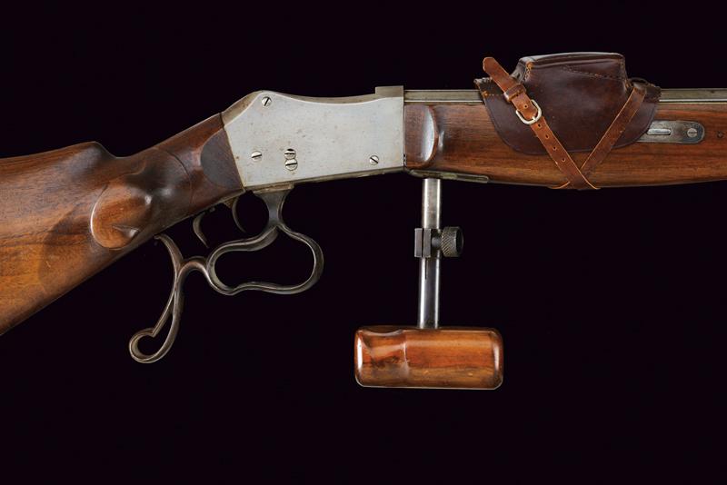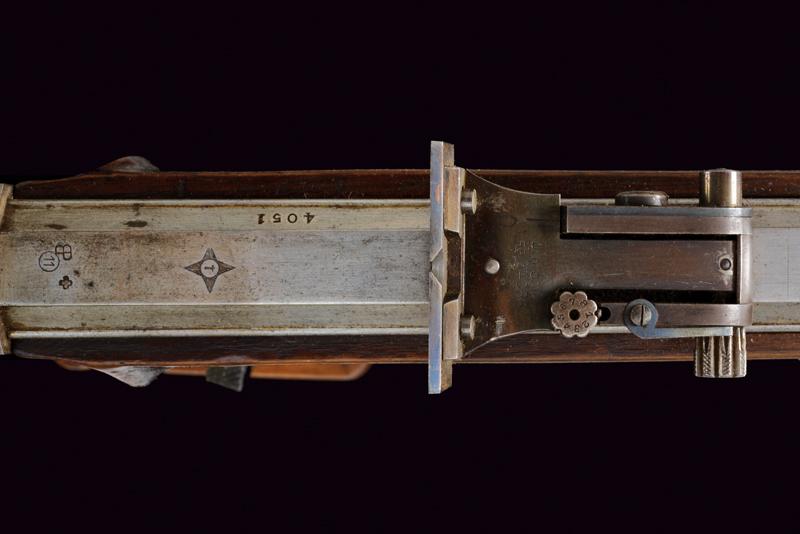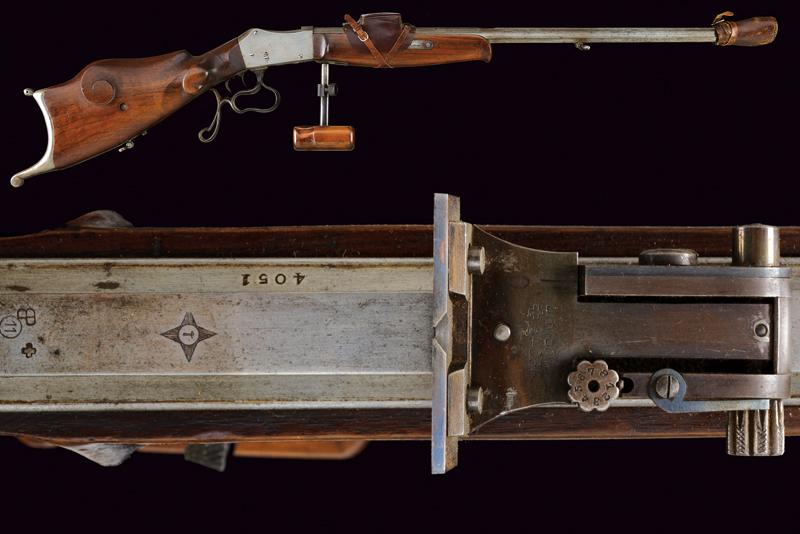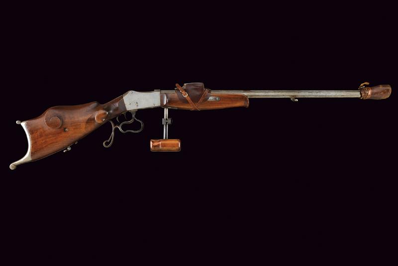 Carabina di tipo Martini da tiro, datazione: 1880 circa provenienza: Svizzera, Pesante canna rigata (anima in perfetto stato), marcato alla base con diversi punzoni e croce elvetica, la prima parte con bindella, dopo con nervature, munito di alzo e mirino di precisione (entrambi con protezione in cuoio), cal. 7,5 mm; otturatore tipo Martini, castello marcato con le stesse punzoni e croce elvetica. Cassa in legno a due pezzi con poggia pollice. Fornimenti in ferro con ponticello a leva. Stecher. Pomolo in legno con gamba in ferro regolabile. lunghezza 129 cm.