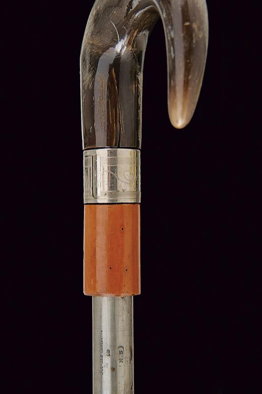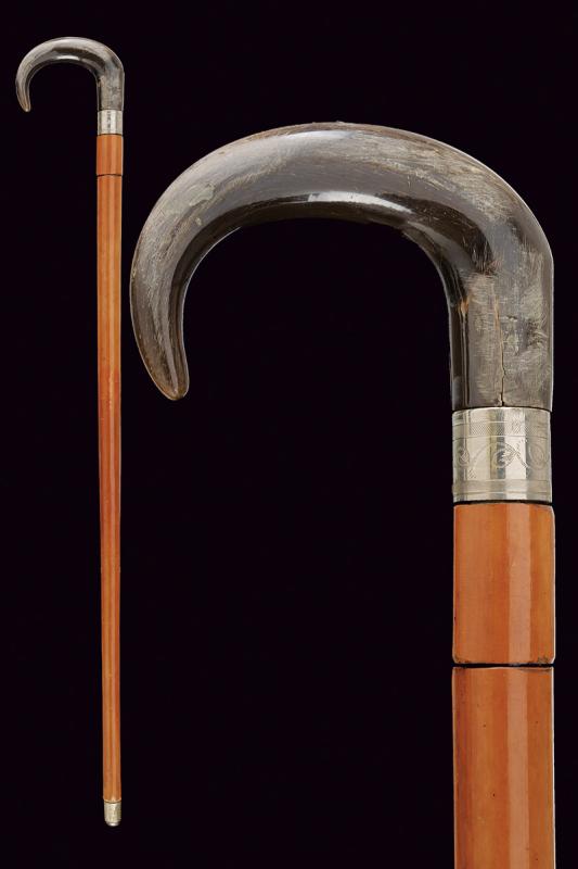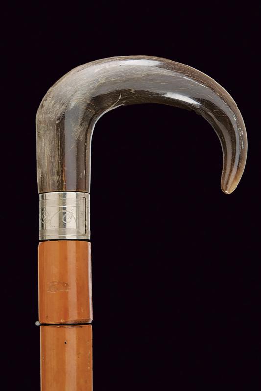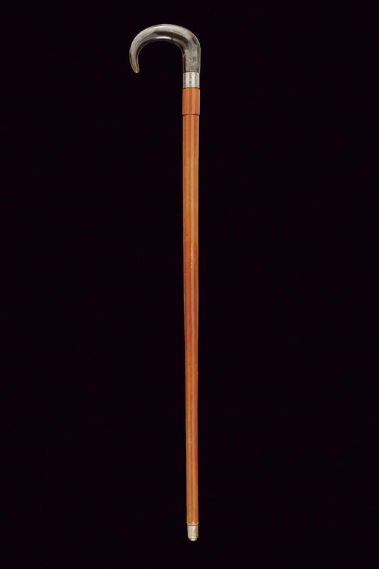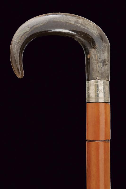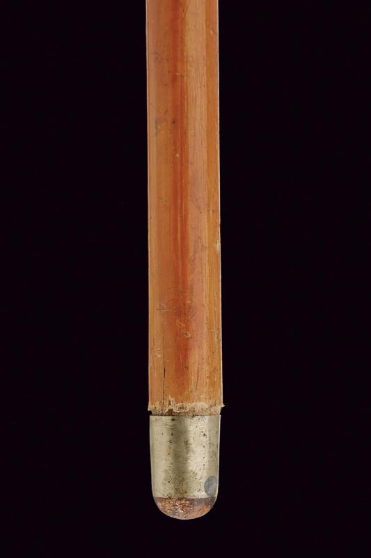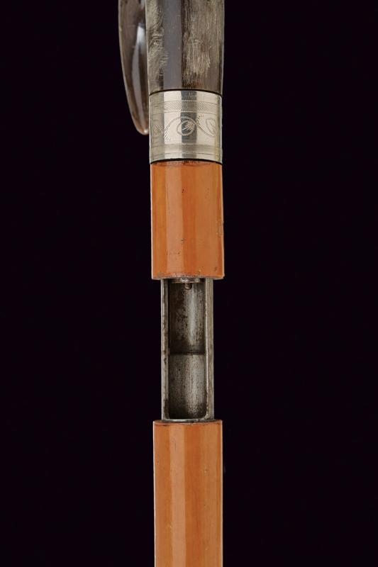 Bastone fucile a percussione centrale tipo 'Dumonthier', datazione: Terzo quarto del XIX Secolo provenienza: Francia, Canna tonda rivestita di legno, cal. 11 mm; impugnatura curva in corno scuro, ghiera decorata, girevole, con grilletto. Dentro marcatura poco leggibile, 'NS' e con punzone sotto corona. Puntale estraibile. lunghezza 95.5 cm.