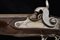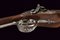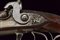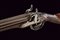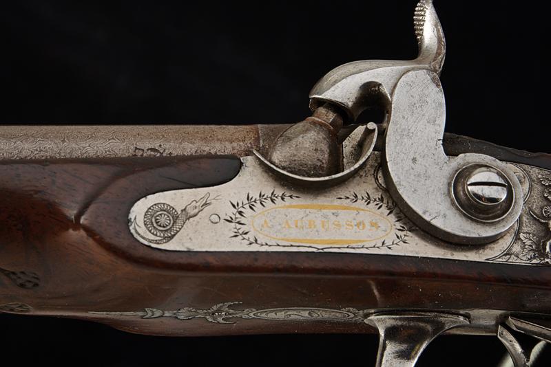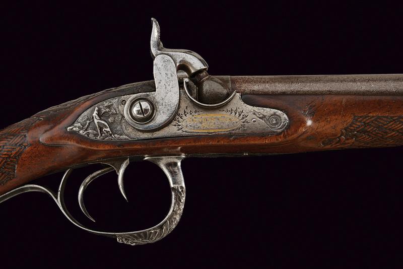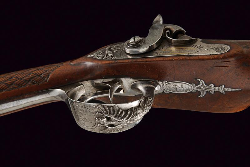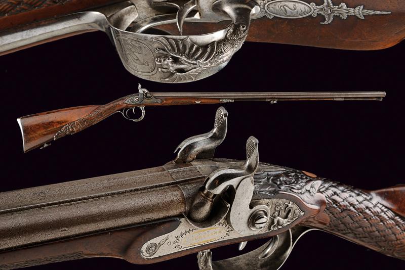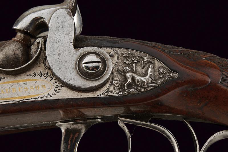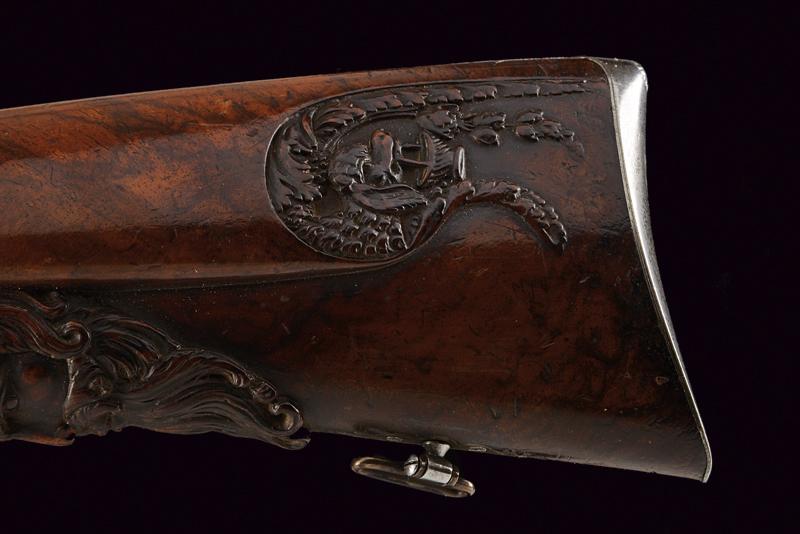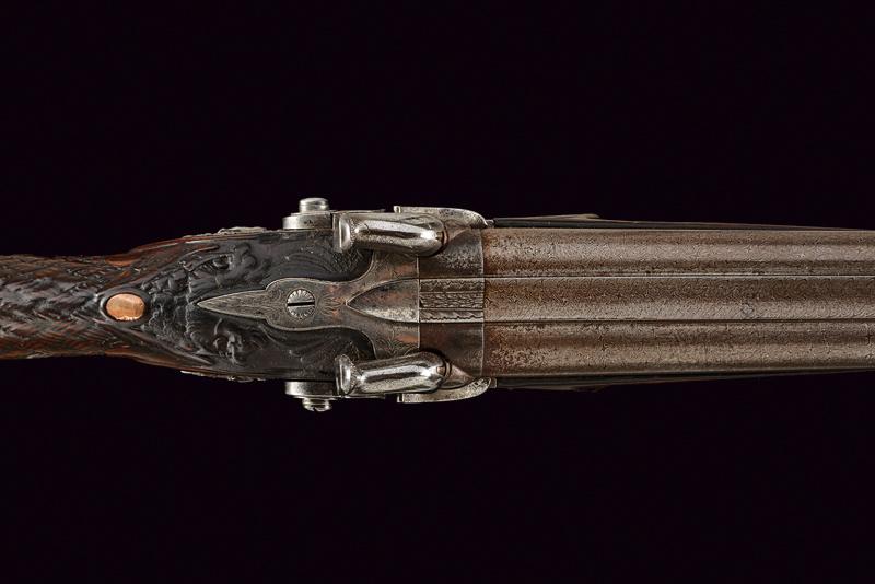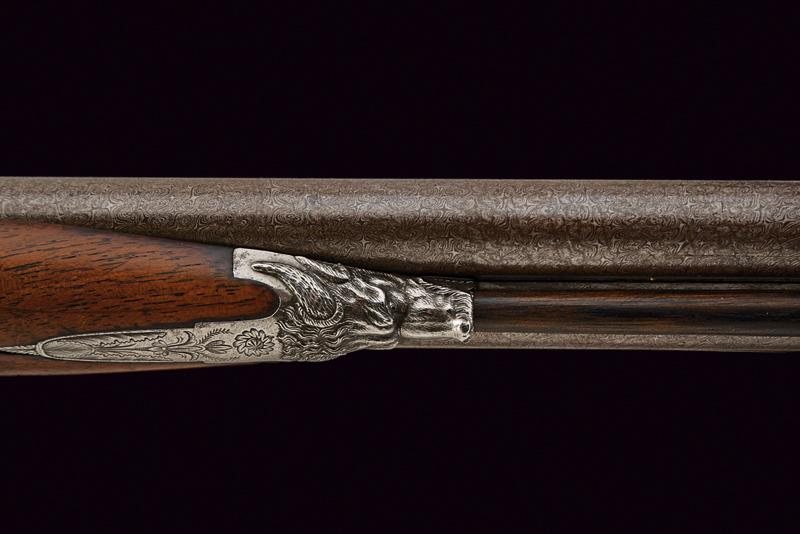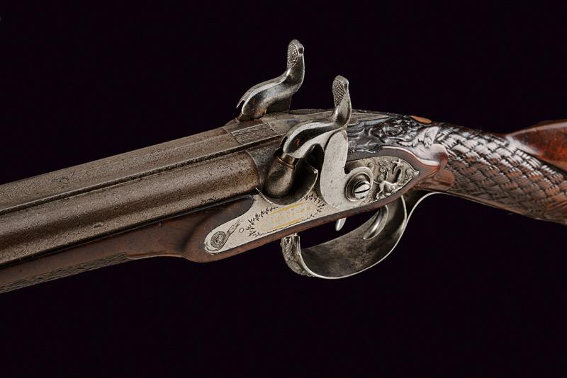 Doppietta a luminello di Renond Fils decorata in rilievo, datazione: Metà del XIX Secolo provenienza: Francia, Canne tonde lisce, in fine damasco, dotate di bindella con mirino in ottone; sul fianco sinistro alla base punzone di St. Etienne. Cal. 16 mm. in volata. Culatte con incisione alla bindella. Il codolo con traguardo a sella e incisioni a racemi. Batterie a molla in avanti, firmate in oro entro una cornice ellittica 'RENOND Fils Paris' a destra e 'A Aubusson' a sinistra. Le cartelle recanti anche incisione a serpente nella parte anteriore e belle scene cinegetiche realizzate in rilievo con segugi alla codetta. Mezza cassa in legno; l'astina con intaglio a effigiare corde intrecciate (segni d'uso), la stessa decorazione presente al collo; sul dorso resti di grifoni. La pala con poggiaguancia recante un agnello in rilievo che regge un cestino con la bocca, circondato da una cornice floreale. La parte inferiore della pala con bel volto in rilievo di una divinità coronata con tralci d'uva (probabilmente Bacco). Fornimenti in ferro. Il ponticello con bellissimo pipistrello realizzato in altorilievo e con un gallo inciso; il bocchino a testa di toro. Bacchetta in legno con battipalla in corno. lunghezza 116,3 cm.