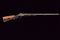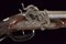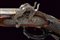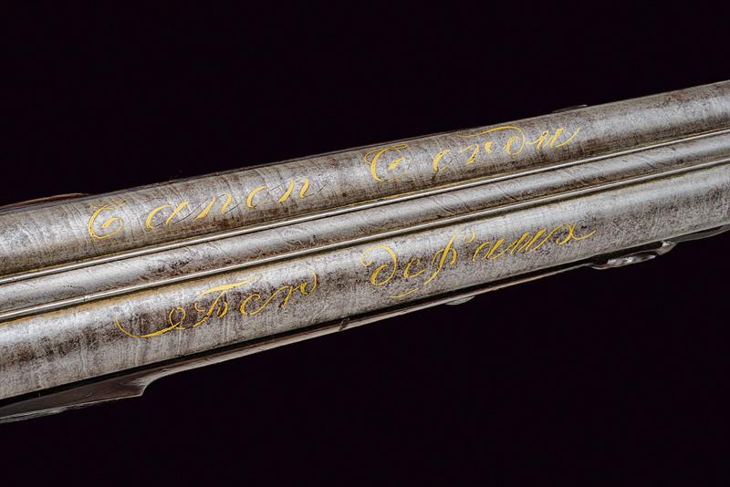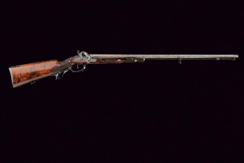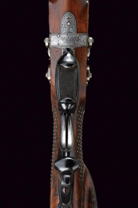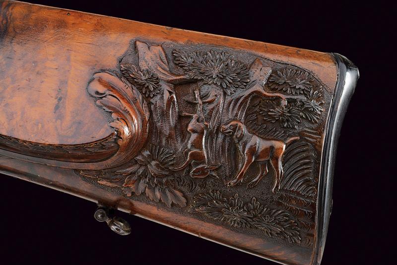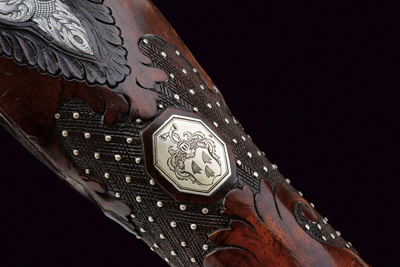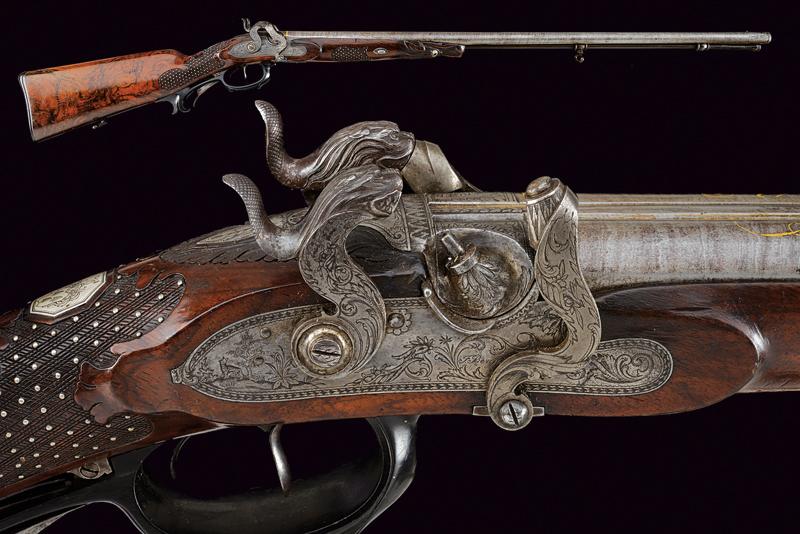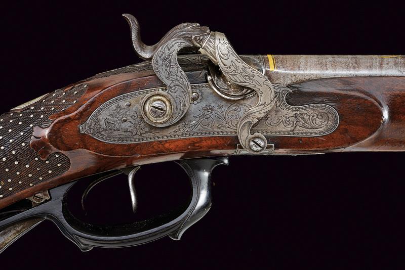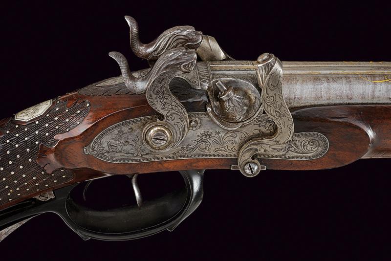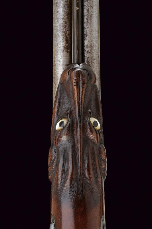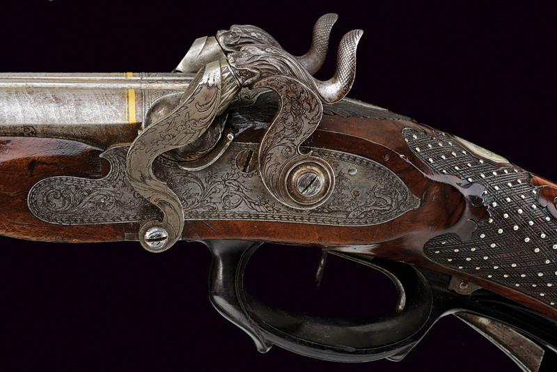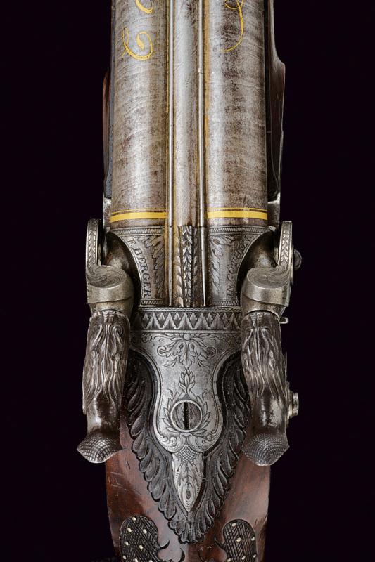Interessante e bellissima doppietta a luminello con sicura di Berger, datazione: 1840 circa provenienza: Cöthen, Canne tonde, lisce, in damasco, con bindella, marcatura in oro 'Canon Tordu Fer de faux'; la base incisa e firmata 'F. Berger in Cöthen'. Cornice in oro, mirino in argento, volata con anello inciso, sul fianco punzone del banco di prova di Liegi, cal. 17 mm. Larga codetta finemente incisa. Batterie a molla in avanti firmate 'F. Berger' e 'in Cöthen', incise finemente a motivi venatori e floreali, i cani intagliati a forma di pesce; su lati i due bracci di sicura, che si azionano con due leve nel ponticello. Mezza cassa in fine radica con poggiamano e collo zigrinati e decorati con chiodini in argento, il muso scolpito con testa di lupo con occhi in madreperla, il lato sinistro della pala con scena di caccia nel bosco in rilievo. Ponticello e coccia in corno nero scolpito. Il fornimento sotto alle batterie in ferro inciso, il dorso con scudetto in argento finemente inciso con stemma nobiliare. Bacchetta in legno con battipalla in corno e cavastracci in ferro. Vedi 'Der Neue Stöckel' Vol. III, Berger è nominato come unico armaiolo della città di Köthen (Cöthen fino al 1927). lunghezza 126 cm.
