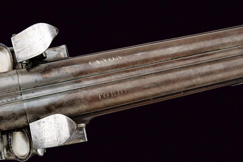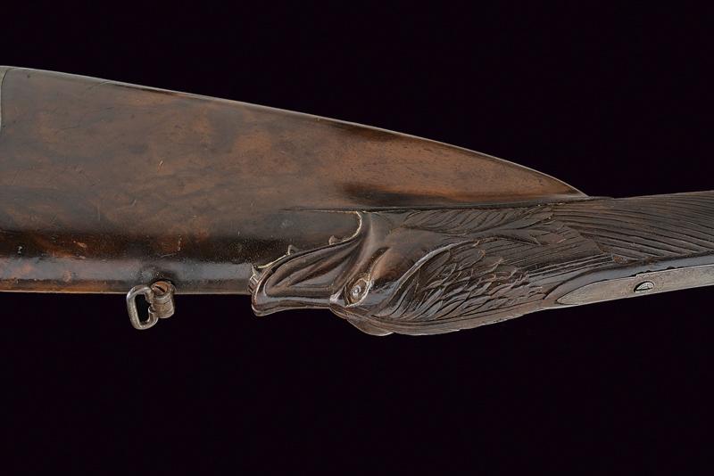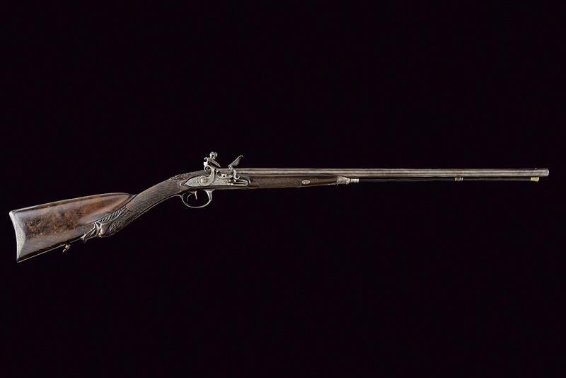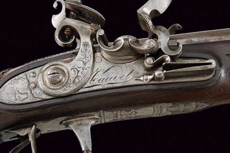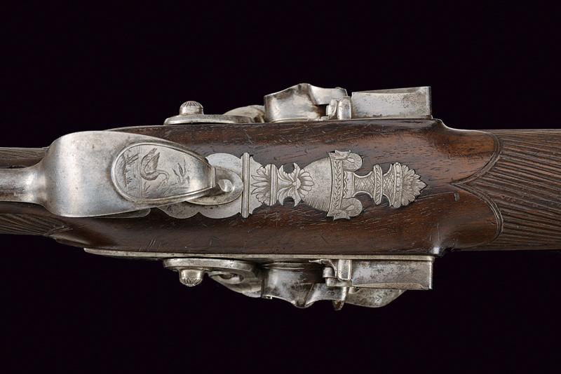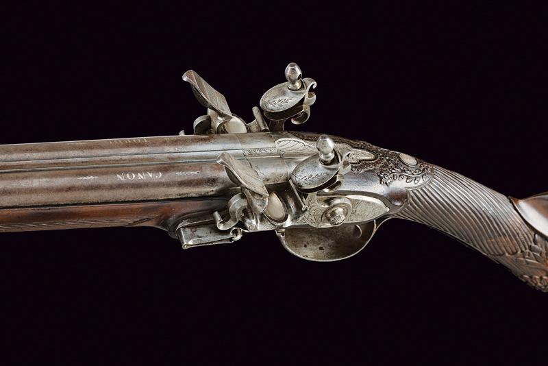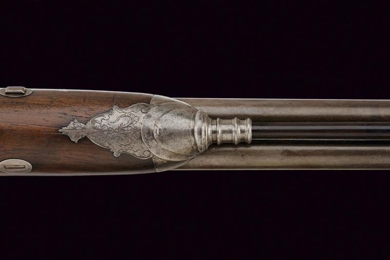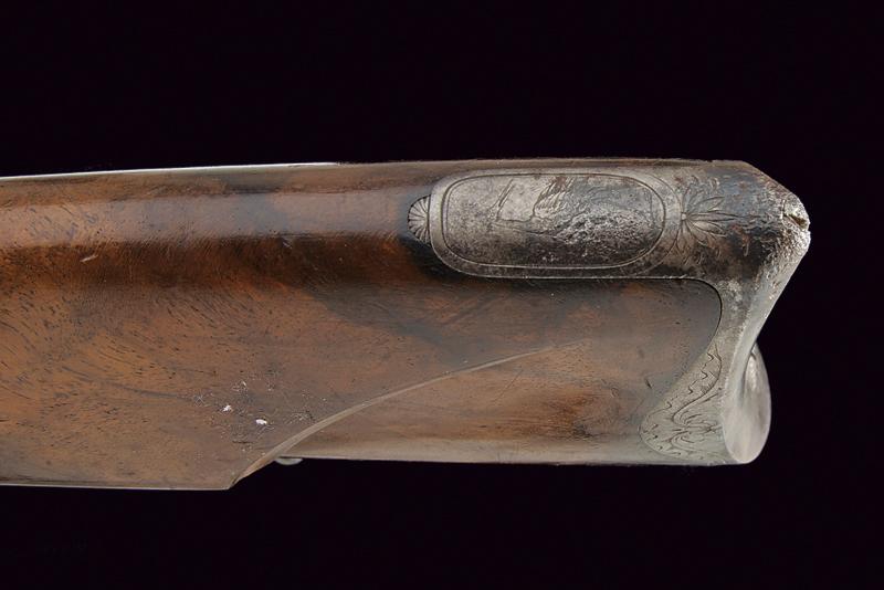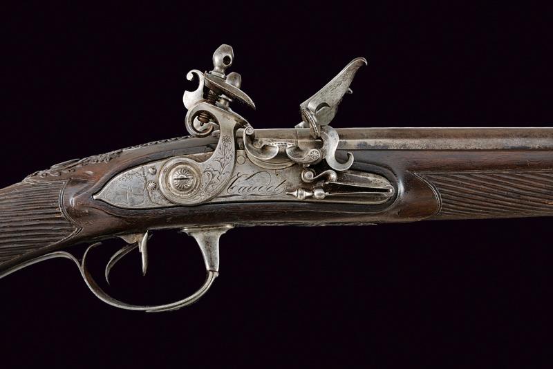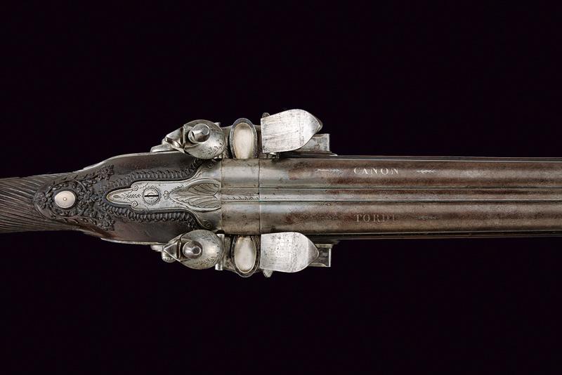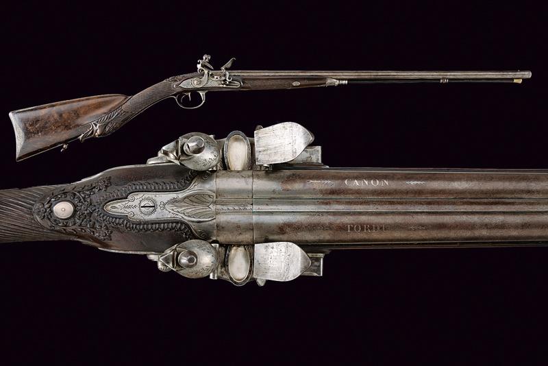 Doppietta a pietra focaia, datazione: Inizio del XIX Secolo provenienza: Torino, Canne tonde lisce, con bindella centrale dotata di mirino, alla base la marcatura 'CANON TORDU' in argento. Cal. 13,9 mm. in volata. Culatte con bindella incisa a foglie. Codolo con traguardo a sella inciso. Batterie a cartella piatta, munite di parascintille, scodellino a tenuta stagna, rotellina antifrizione. Cartelle con incisioni effigianti un segugio su un lato, uccelli su quello opposto; al centro la firma 'Maudol / a Turin'. Meccaniche funzionanti. Mezza cassa in legno, il collo e l'astina decorati a cannellini lavorati a spire. Il dorso con intagli floreali, la parte inferiore della pala con testa di mostro scolpita. Fornimenti in ferro in stile impero. Ponticello con effige di un cigno e con vaso. Calciolo con incisioni e intaccature. Il bocchino inciso a fiorami. Bacchetta in legno con cavastracci in ottone e bacchetta in ferro. lunghezza 106 cm.