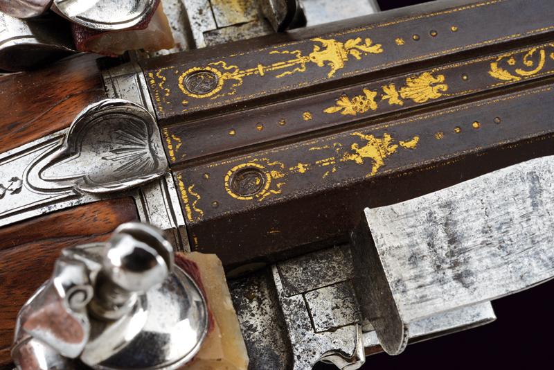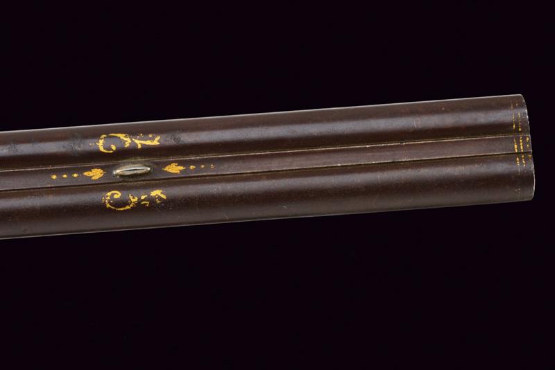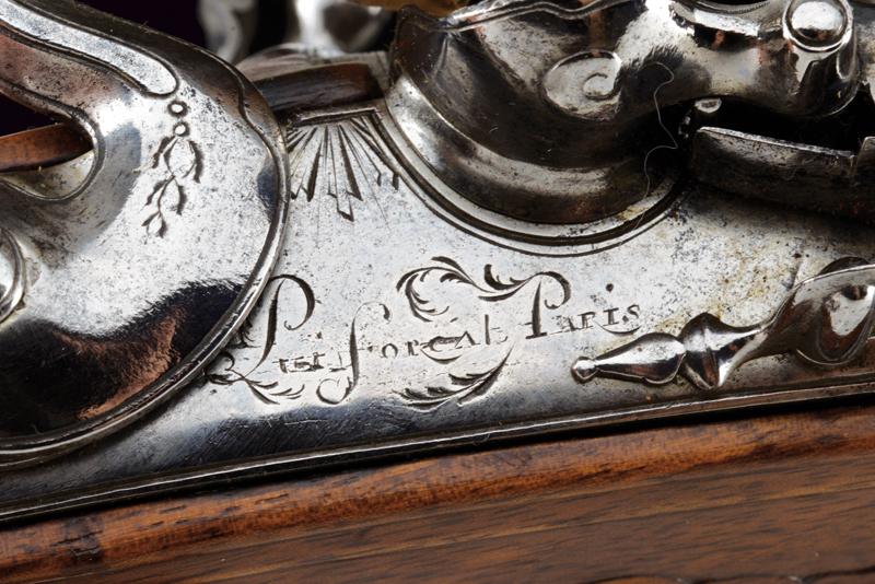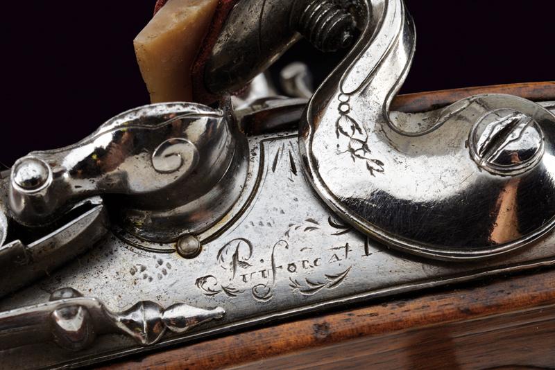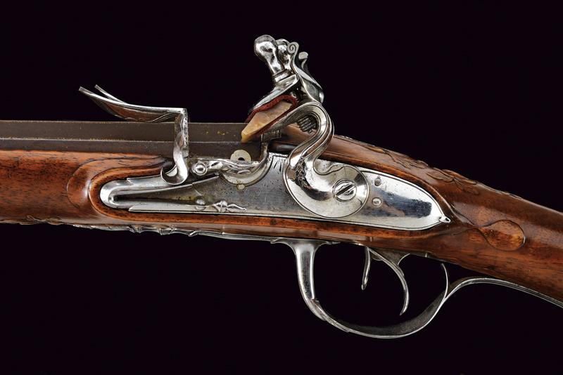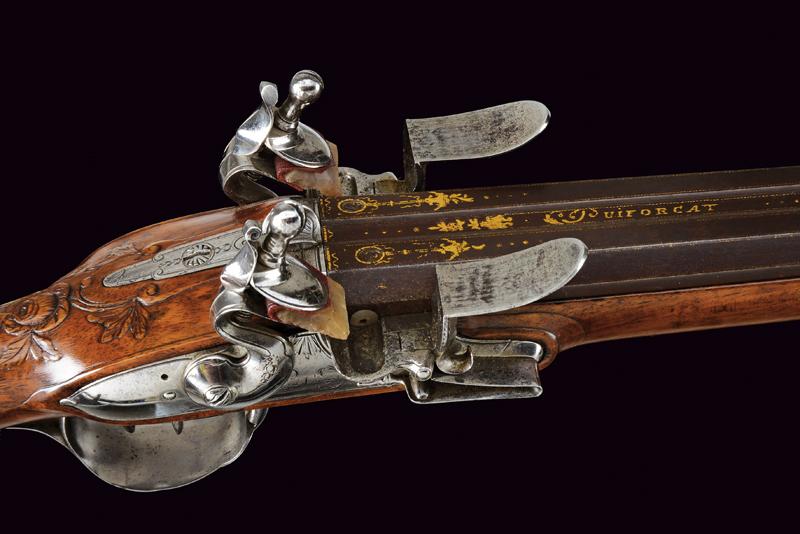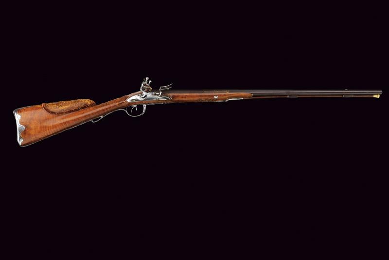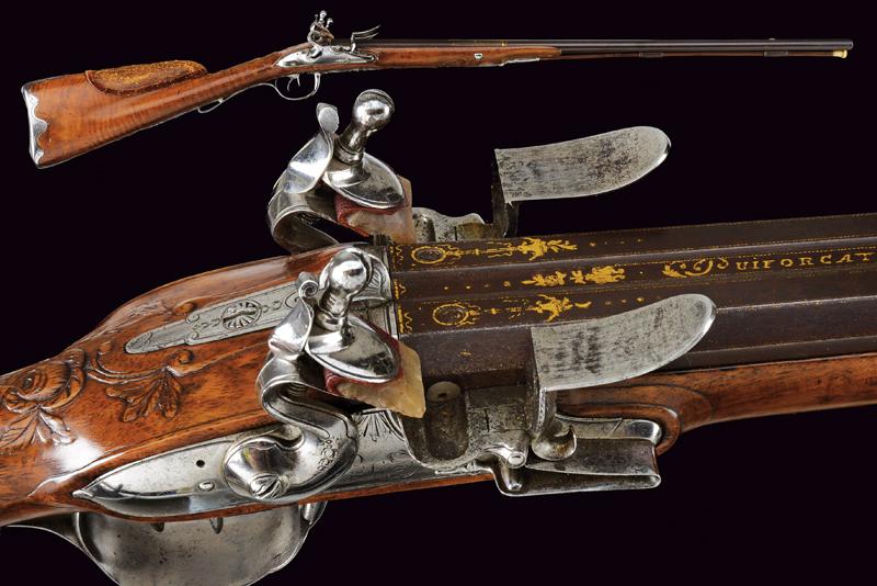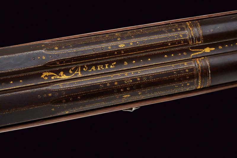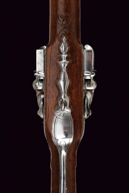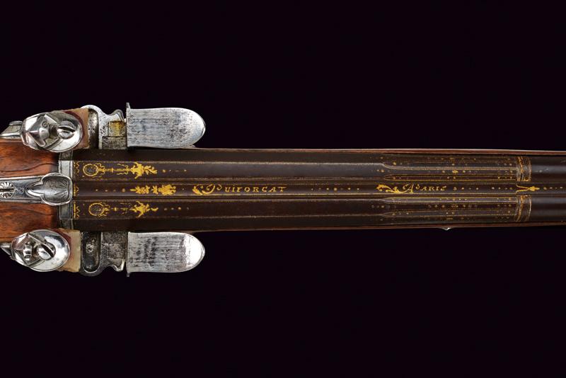 Bella doppietta a pietra focaia di Puiforcat, datazione: 1770/80 provenienza: Parigi, Canne lisce, con bindella, a tre ordini, la prima parte ottagonale firmata e decorata in oro 'PUIFORCAT A PARIS', la base con due punzoni 'LC' in ovale (Leclerc), dopo un segmento a sedici facce tonde, mirino in argento con decorazioni in oro, cal. 14 mm; codetta in ferro con traguardo, incisa a motivi floreali; batterie a pietra focaia firmate 'PUIFORCAT PARIS' e decorati a eleganti incisioni. Mezza cassa in legno scolpito con fini ornamenti floreali in bassorilievo. Il calcio con cuscino foderato rivestito di cuoio (segni d'uso) e con cornice in velluto marrone. Altrettanto eleganti fornimenti in acciaio. Bacchetta in legno con battipalla in corno di cervo. Per Pierre Puiforcat vedi 'Der Neue Stöckel', Vol. II, pag. 992. I'armaiolo è documentato a Parigi dal 1756 al 1773 e fu nominato come 'Premier Arquebusier du Roi'. Fu l'esperto della riforma di armi del 1773.Provenienza: Galeria Fischer, Lucerna, 11 Settembre 2010 lotto 581 lunghezza