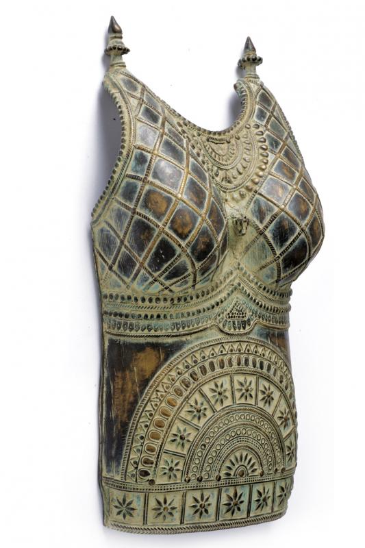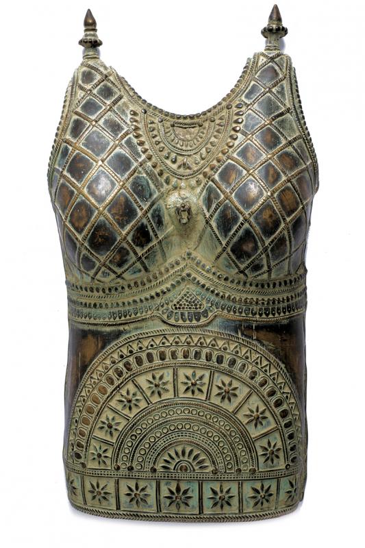 Bella replica di un pettorale all'antica in bronzo, da donna, datazione: XIX Secolo provenienza: Grecia, In bronzo riccamente decorato in bassorilievo a motivi floreali e geometrici; tra i seni una testa di leone a tutto tondo. altezza 44 cm.