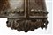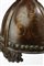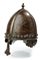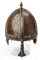 Elmo in stille normanno , datazione: XIX Secolo provenienza: Europa orientale, Elmo conico in ferro di forma ogiva con pinnacolo tornito in bronzo, all'esterno quattro bandelle schiacciate di cui la frontale lavorato a nasale con estremità a trifoglio. Sulla base e sul nasale sono collocate una fitta serie di rosette in ottone alternate a chiodature cuspidate. Orecchioni e parte della gronda lavorati a squame in ferro a forma di trifogli modanati. Sulle parti del coppo rimangono cospicui resti di decori dipinti in oro. In patina. altezza 29 cm.