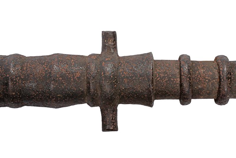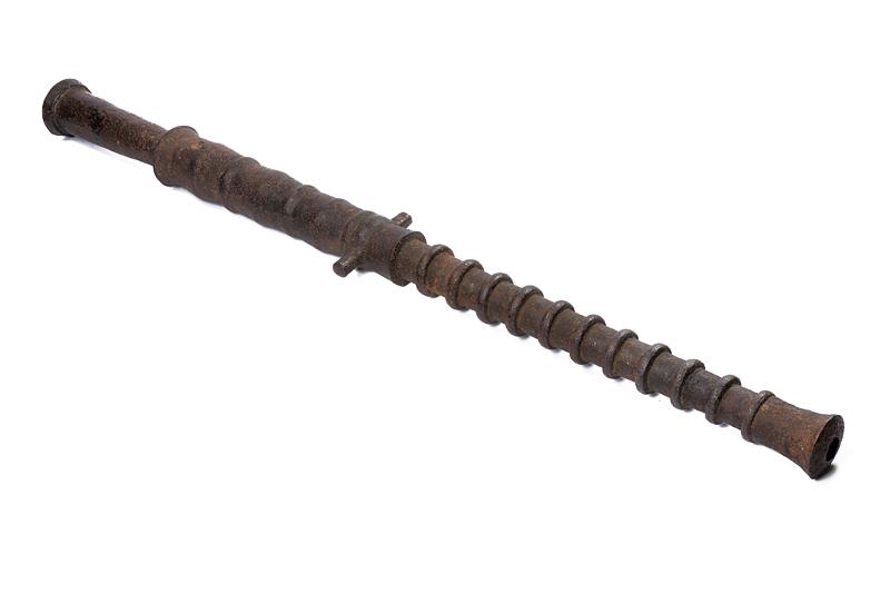 Rara e grande petriera, datazione: XV Sec. provenienza: Italia, Struttura in ferro di forma quasi cilindrica. In due ordini. Il primo lavorato a sezioni troncoconiche alternate ad anellature. Al dorso il piccolo focone dentro una base incavata (probabilmente con resti di un copriscodellino). Al centro gli orecchioni cilindrici. Il secondo ordine cilindrico e rinforzato con una sequenza di undici spesse anellature. Infine la volata, con spessa gioia di bocca di forma strombata. Il calibro di 30 mm. Dietro alla culatta un lungo pomo di forma troncoconica e cavo, rinforzato al bordo da un'anellatura. lunghezza 146 cm.