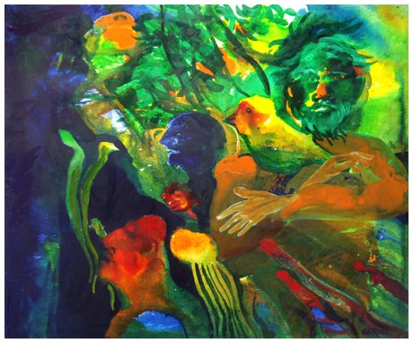 ROBERT CARROLL Painesville (Stati Uniti) 1934 Tail tales Acrilici su tavola 50,5 x 61,8. Firma in b. a d.; sul verso arch., titolo, tecnica e misure.