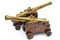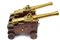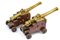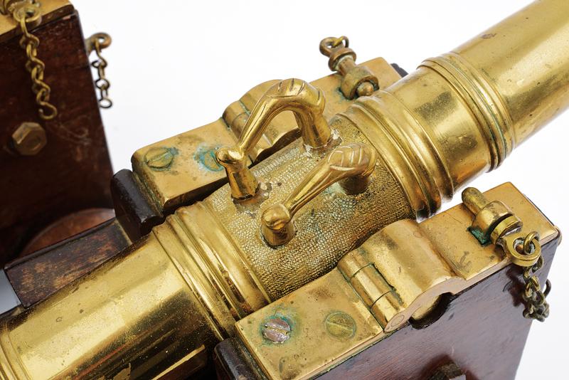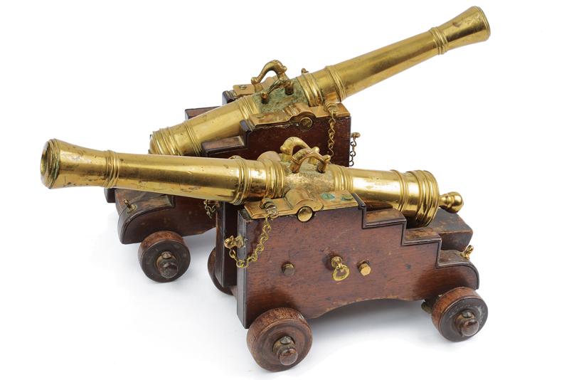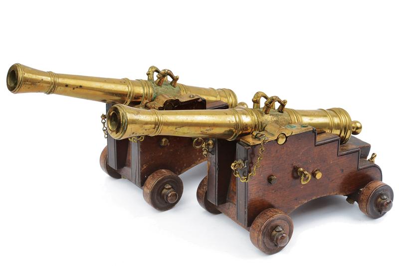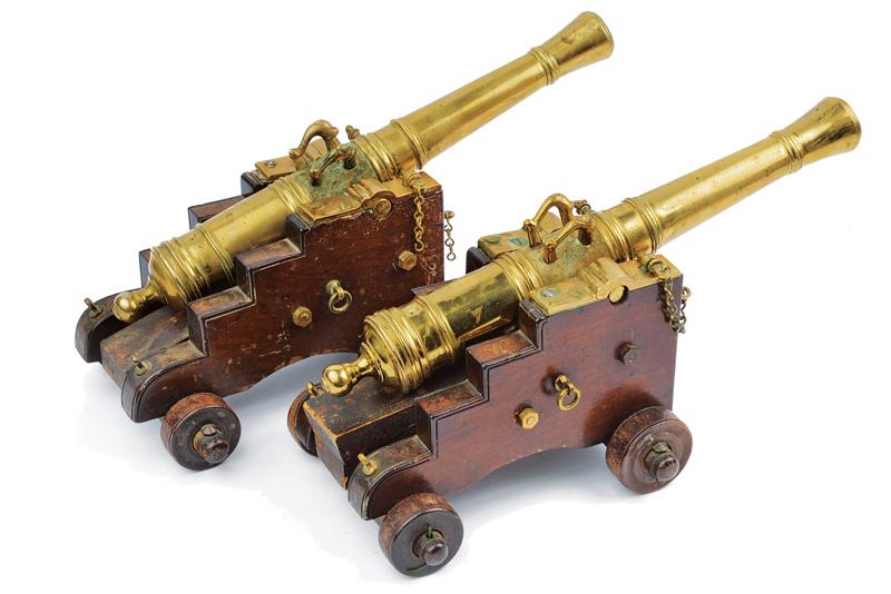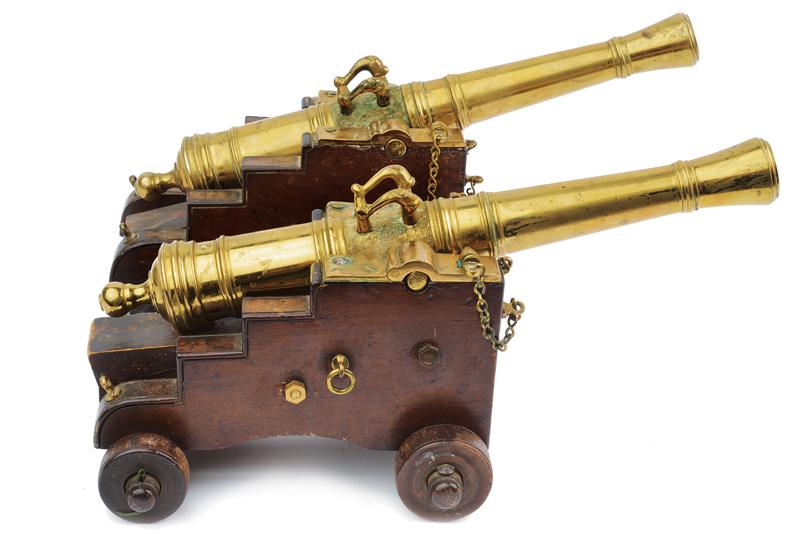 Paio di piccoli cannoni in bronzo su affusto navale, datazione: 1840 circa provenienza: Inghilterra, Canne in ottone (36.5 cm) decorate ad anellature, maniglioni a delfino, volata con gioia di bocca, focone dorsale. Su affusti in legno con fornimenti in ottone. lunghezza total 39 cm.