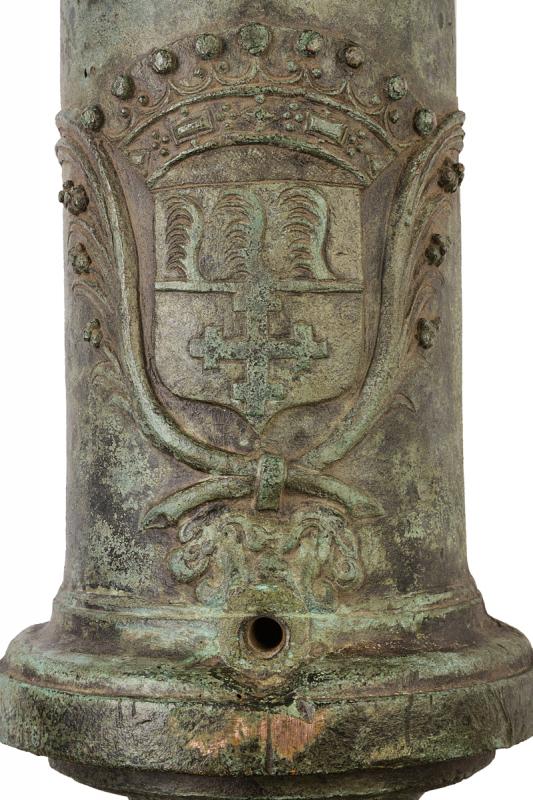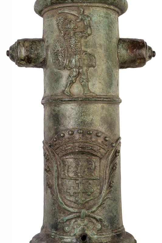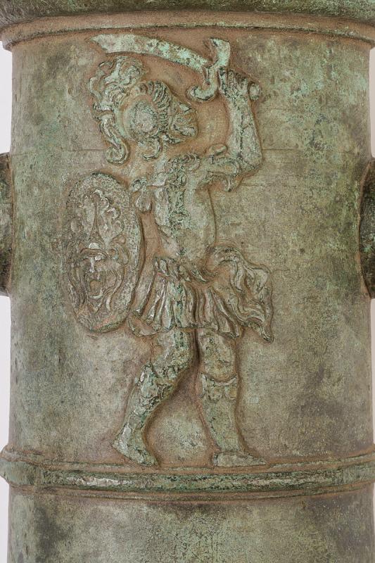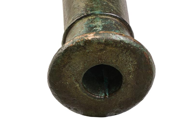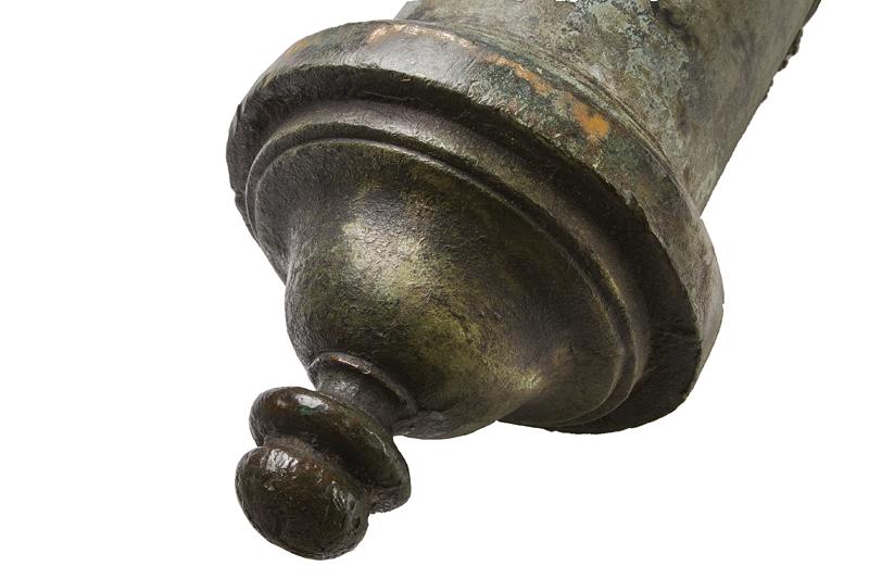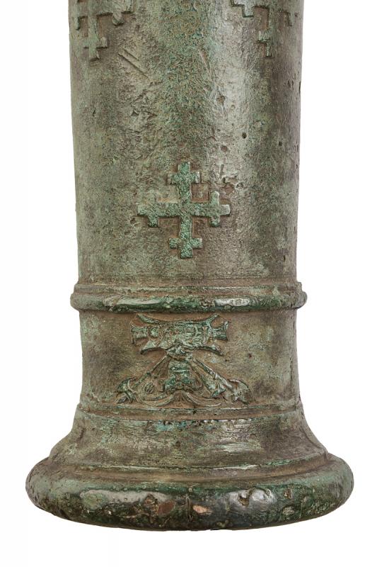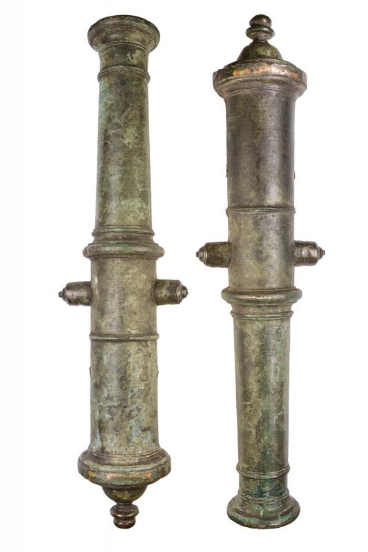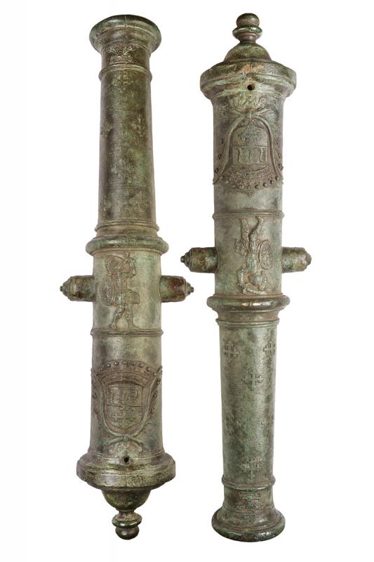 Rarissimo paio di cannoni datati e recanti stemma, datazione: 1652 provenienza: Spagna, In bronzo. Di forma troncoconica. Dotati di gioia di bocca subito seguita da un trofeo d'armi e armature sormontante un cartiglio con la data '1652'. Il segmento seguente delimitato da due anellature e ornato al dorso con croci incrociato. La parte centrale con una spessa anellatura in alto e l'effige in rilievo di un guerriero in vesti d'epoca classica, con la spada levata, pronta a colpire e il grande scudo con l'effige del volto di Medusa. Gli orecchioni cilindrici culminanti in estremità a campana. Il segmento alla base recante un grande emblema araldico, anche questo ben rilevato. Lo scudo caricato con tre palme e croce incrociata, sormontato da una corona da conte e fra grandi palme intrecciate. Il focone, al dorso, subito seguito da una spessa anellatura che precede la culatta. Questa, a forma di campana, è munita di un grande pomo lavorato en suite. lunghezza 96 cm.