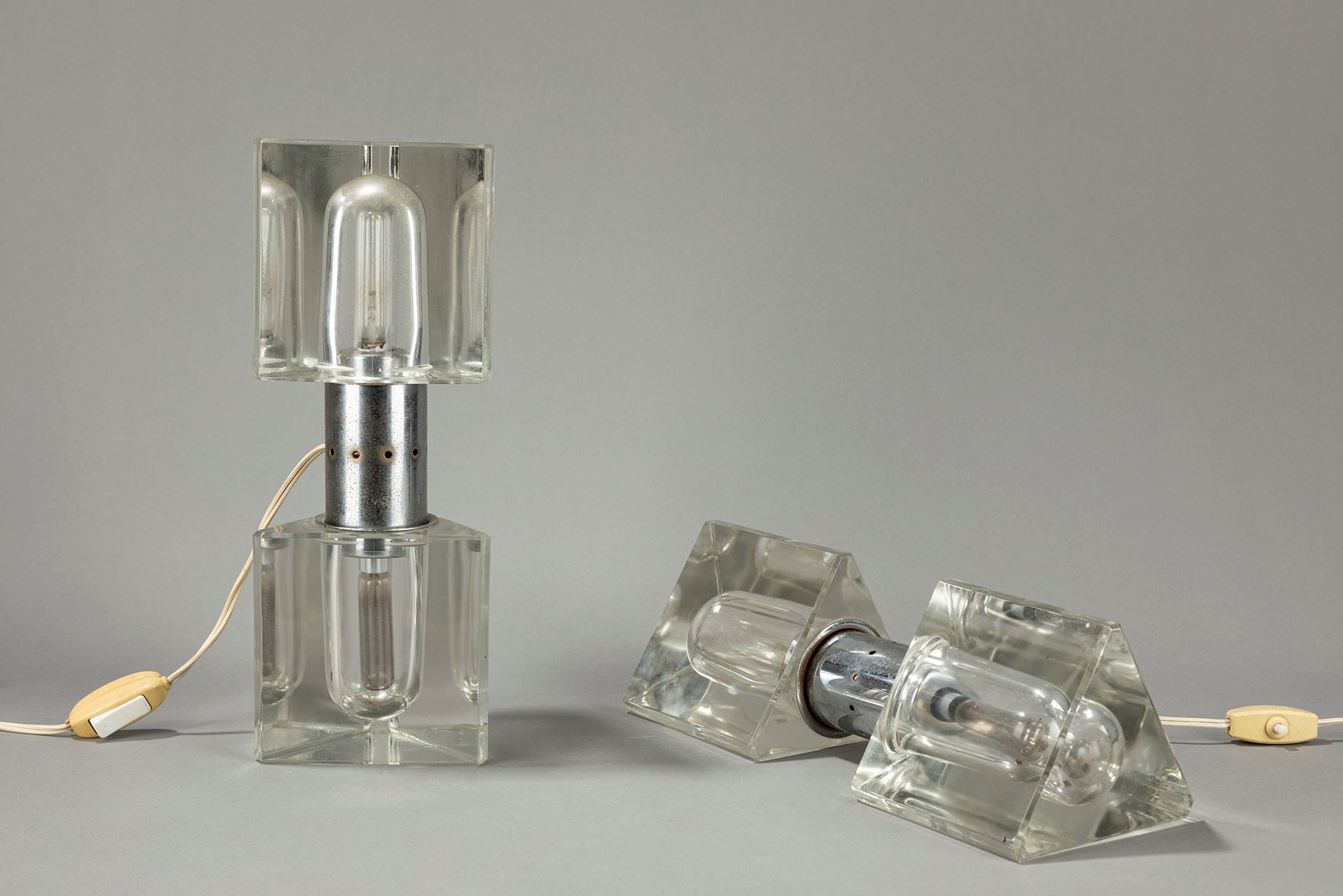 Albano Poli - Due lampade da tavolo34 x 11 cm in vetro di grosso spessore e metallo cromato.