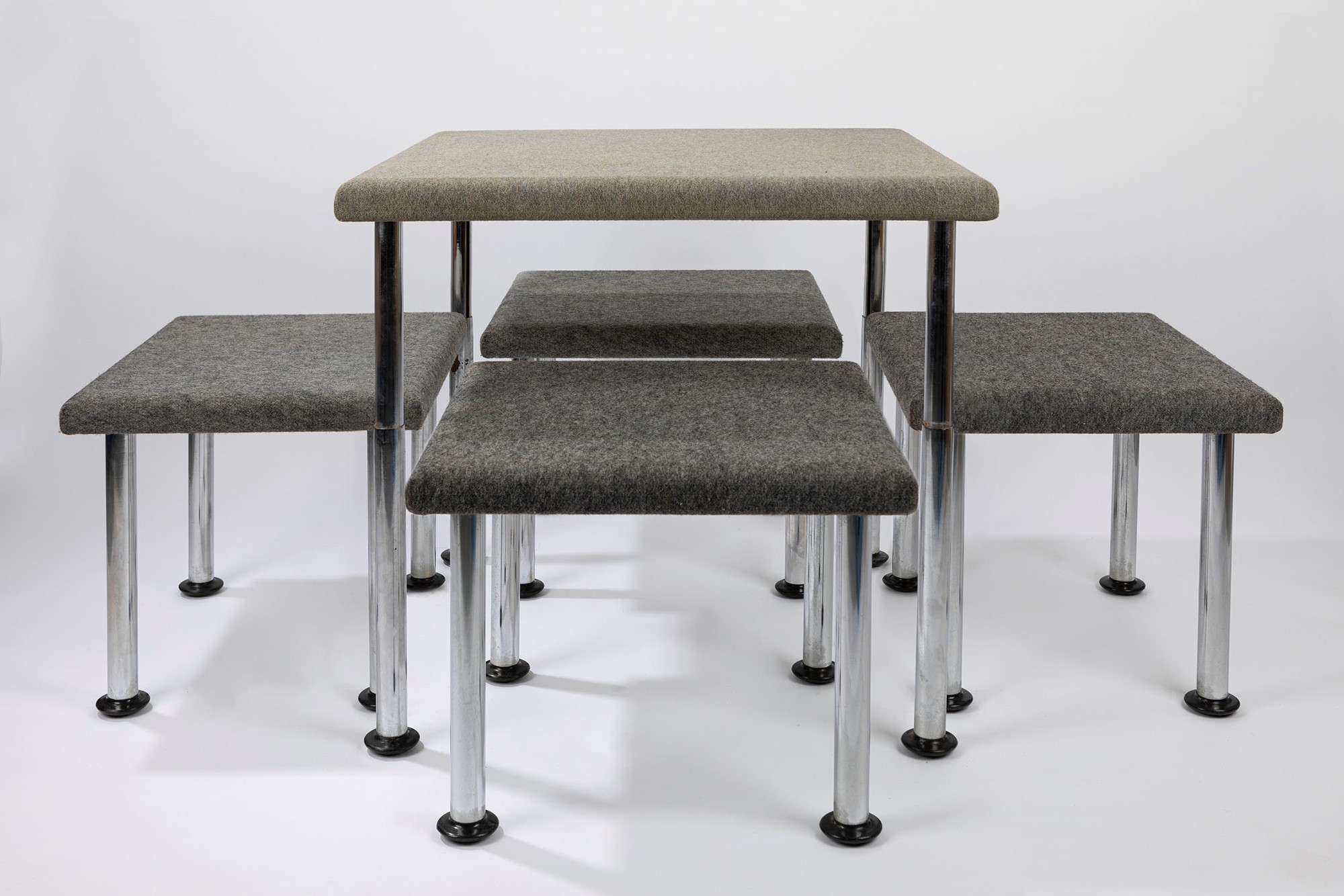 Roberto Gabetti, Aimaro Isola - Tavolo e quattro sgabelliTavolo: h 55 x 55 x 42 cm - sedie: 55 x 55 x 42 cm; con gambe in metallo cromato e piano rivestito in Tapisom.