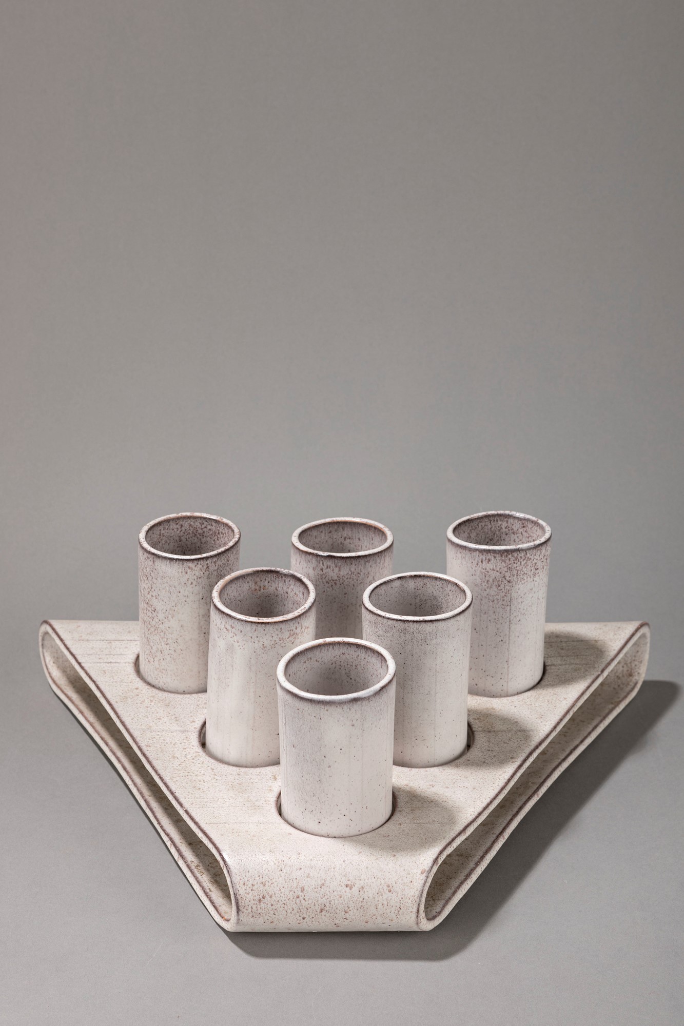 Alessio Tasca - Set di sei bicchieribase 29x29x29 cm; bicchiere 12,5x5 cm da vodka in gres grigio su supporto in gres.