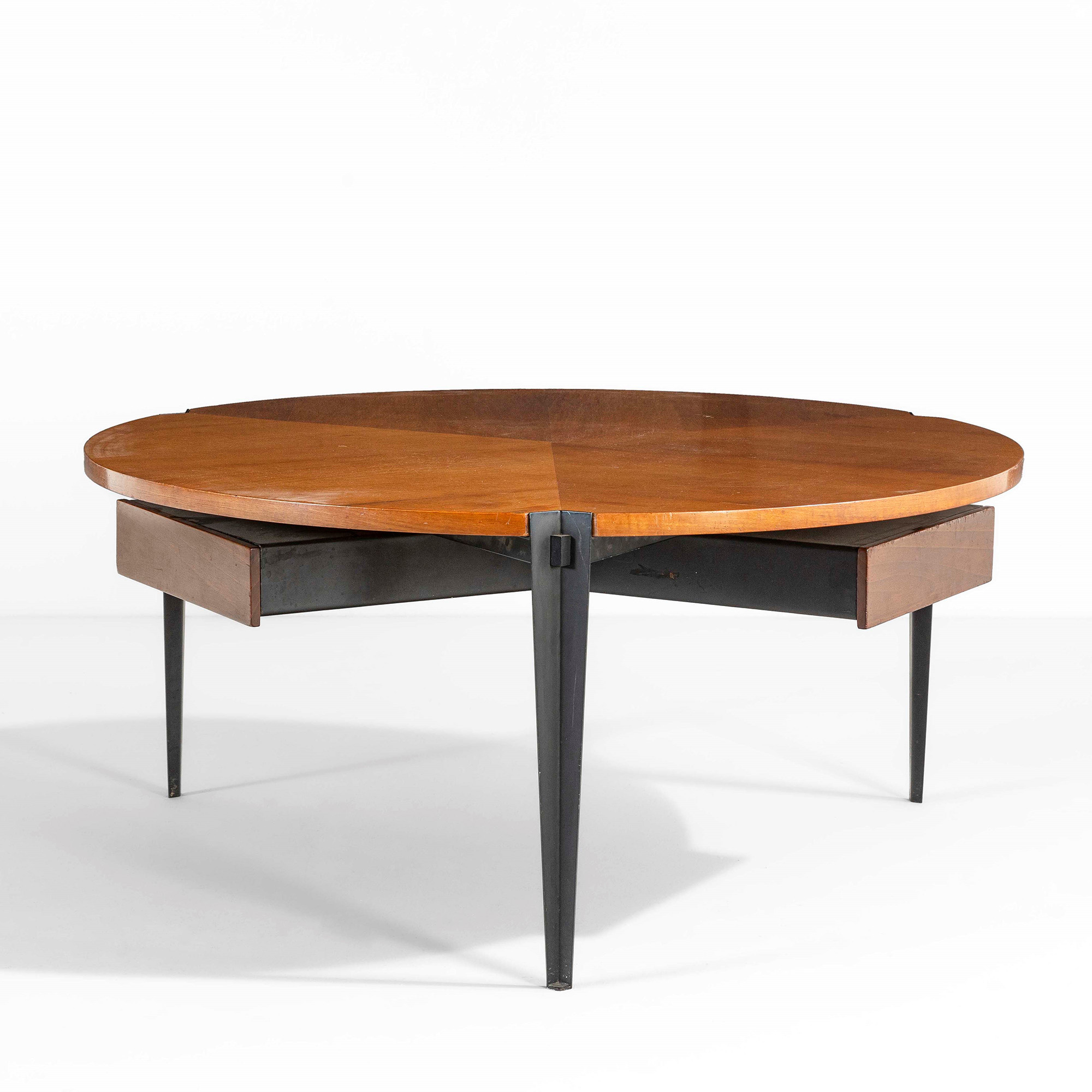 Osvaldo Borsani, Tavolo basso mod. SNC0021a con struttura in metallo brunito, e piano in legno., Prod. Tecno, Italia, 1957, W. 90 - D. 90 - H. 41 cm, Bibliografia, G. Bosoni, Osvaldo Borsani, architetto, designer, imprenditore, p.599, Skira, 2018