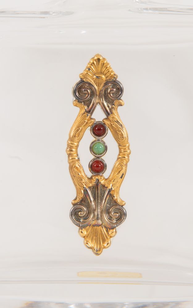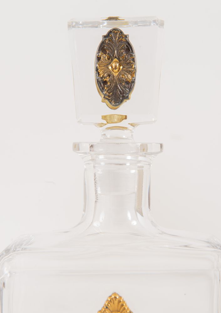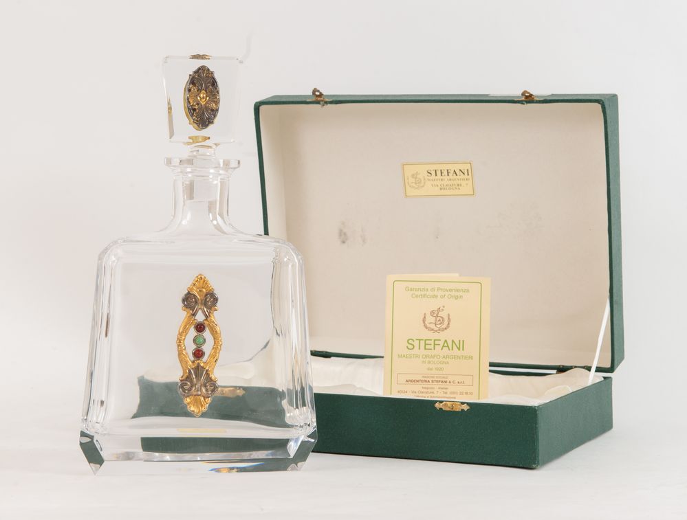 ARGENTERIA STEFANI, Bologna, XX secolo. Bottiglia con tappo in cristallo entro scatola originale Stefani. Reca particolari in argento 800, parti dorate con oro 24 kt e cabochon di corniole e aventurine. Disegno originale Stefani, lavorato secondo le antiche e raffinate tecniche artigianali dell’officina Stefani. Reca punzone 800 sui particolari d’argento. Accompagnata da garanzia di provenienza Stefani. Cm 27x16x8.