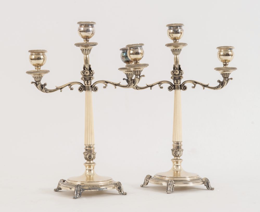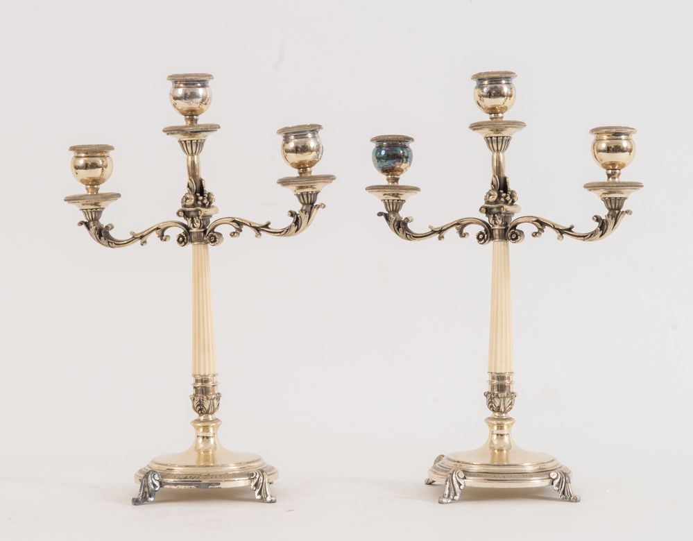 PERUGGIA & C., Alessandria, XX secolo. Coppia di candelabri di pregiata fattura italiana in argento 800 e avorio vegetale. Peso complessivo: 1110 gr.