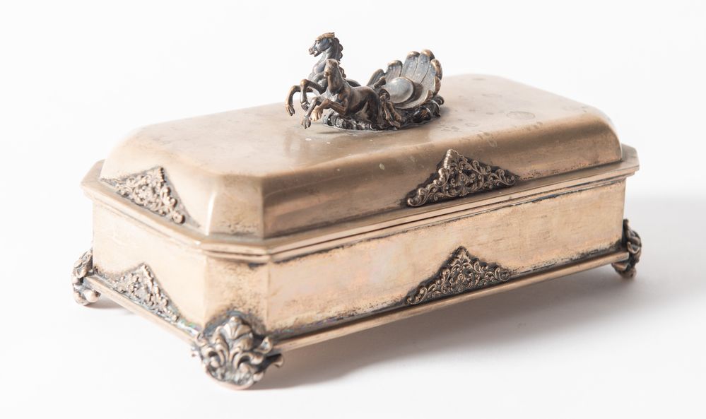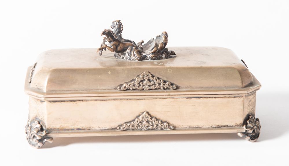 SCATOLA in argento 800. Sotto la base reca punzone 800. Cm 10x21,5x11. Peso: 956 gr.