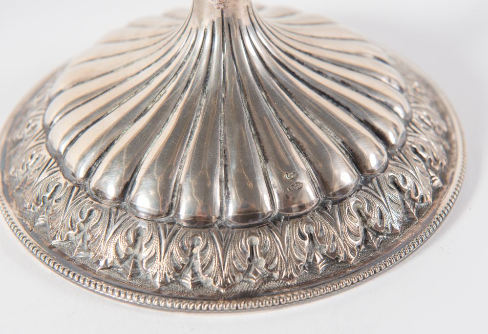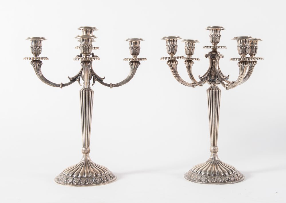 MILANO, prima metà del XX secolo. Coppia di candelabri in argento 800. Sul bordo inferiore recano punzoni: 800 e losanga locativa milanese con fascio littorio. Cadauno di cm 36xØ 28. Peso complessivo: 2.406 gr.