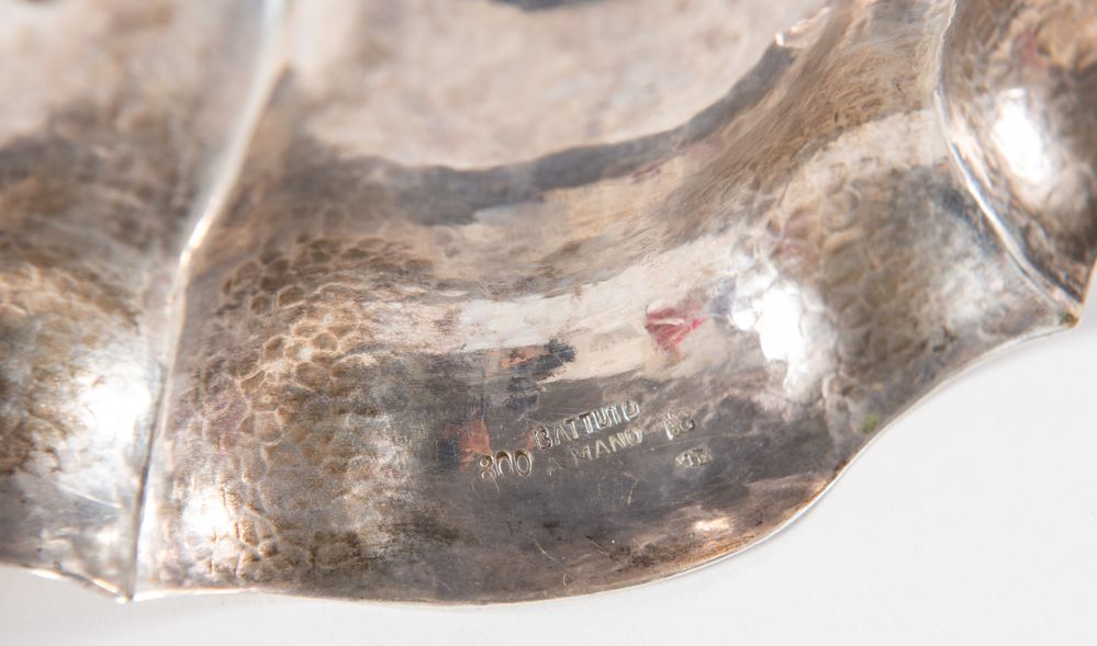 ITALIA, XX secolo. PIATTO tondo con bordo polilobato in argento 800. Sul bordo inferiore reca punzoni: 800, battuto a mano, losanga locativa e stemma dell'argentiere indecifrati.