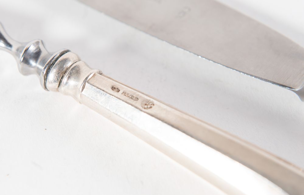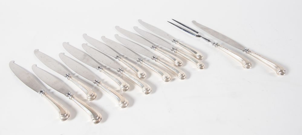 FABBRICA ARGENTERIA CLEMENTI dì GIOVANNI MANTEL & C. S.p.A., Bologna, XX secolo. Servizio di coltelli con manico in argento 800. Composto da dodici coltelli e due posate da portata. Sul manico recano punzoni: 800, losanga locativa 1BO e stemma dell'argentiere. Coltelli: cm 25,5; coltello da portata cm 31; forchettone: cm 29. Peso complessivo: 1698 gr.