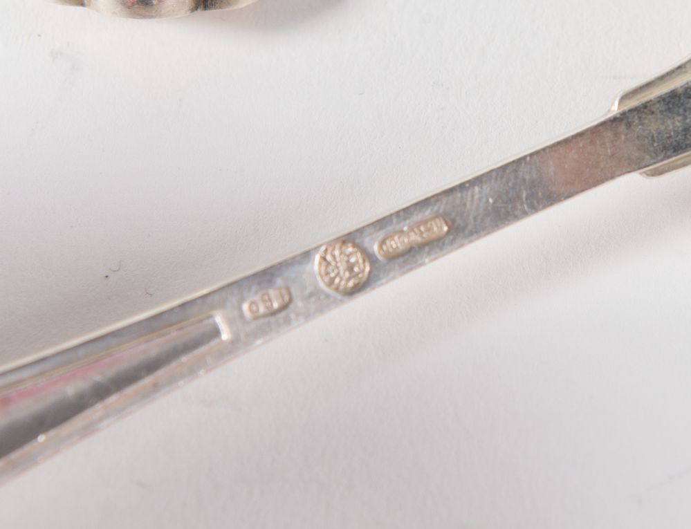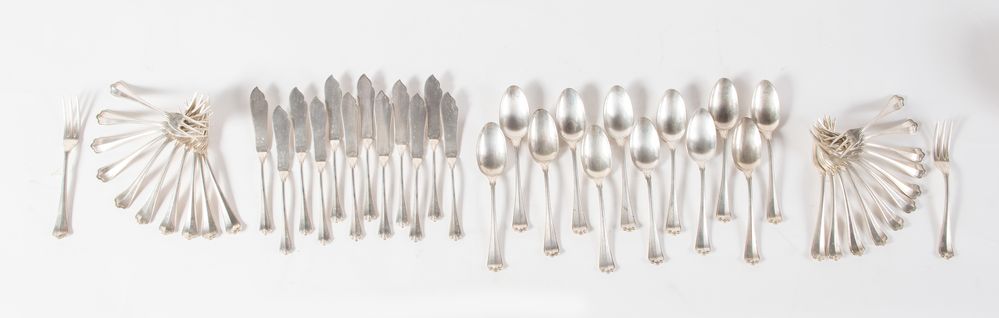 SERVIZIO DI POSATE in argento 800 composto da ventitre forchette, dodici cucchiai e dodici coltelli. Al retro recano punzoni 800, losanga locativa non identificata. Forchetta: cm 18; cucchiaio: cm 18,5; coltello: cm 18,5. Peso complessivo: 3002 gr.