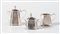 T.M. Italia sas, Bolzano, XX secolo. Servizio da caffè in argento 800, composto da tre elementi: caffettiera, lattiera e zuccheriera. Sotto la base recano punzoni: 800, battuto a mano, stemma dell'argentiere e losanga locativa 104BZ. Caffettiera: cm 11,5x12,5x8; lattiera: cm 7x9,5x7,3; zuccheriera: cm 8,5x8x9. Peso complessivo: 625 gr.