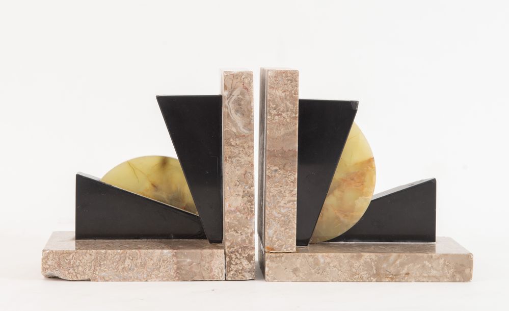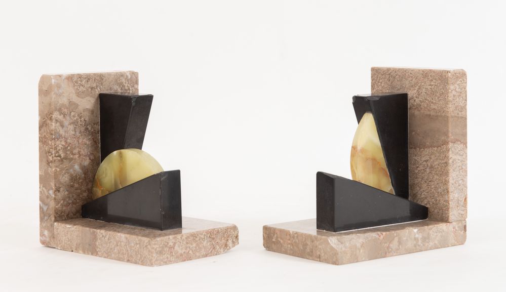 COPPIA DI FERMALIBRI in marmo decò. Cadauno di cm 15x14,5x9,5.