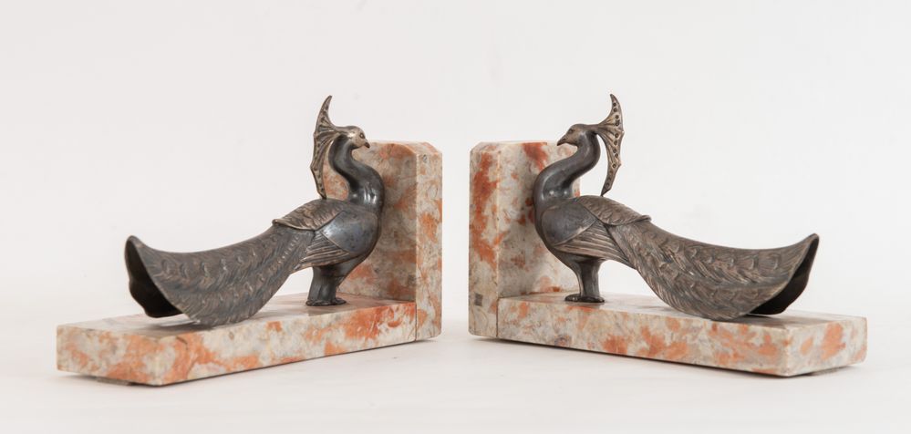 COPPIA DI FERMALIBRI in marmo e bronzo argentato. Raffiguranti pavoni. XX...