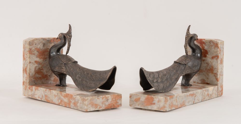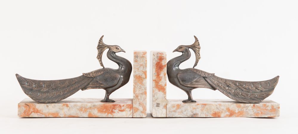 COPPIA DI FERMALIBRI in marmo e bronzo argentato. Raffiguranti pavoni. XX secolo. Cm 10,5x21,5x7,3.