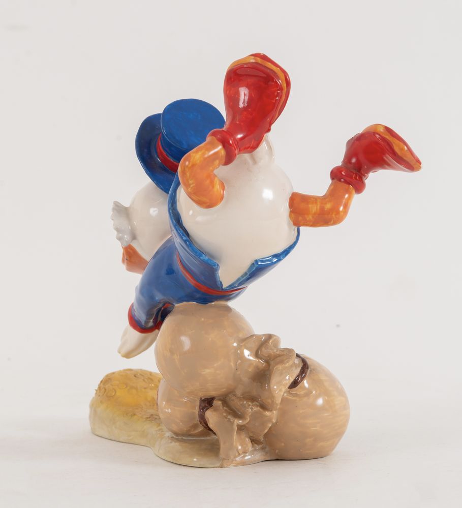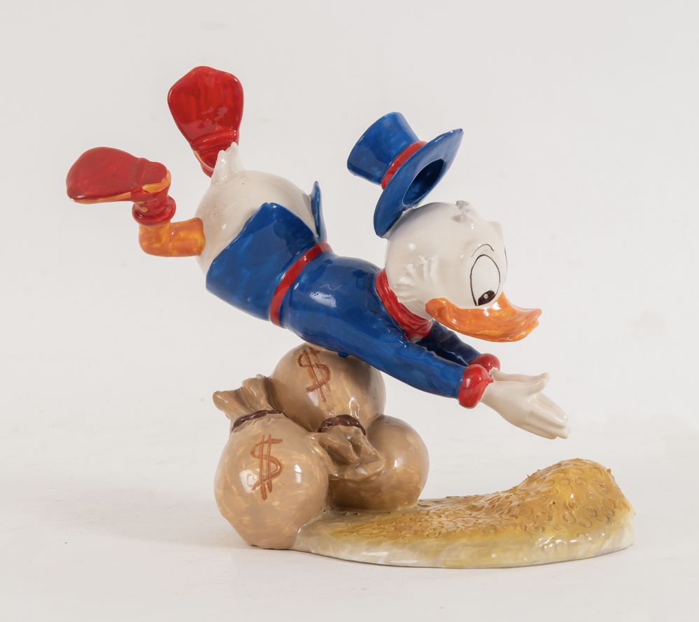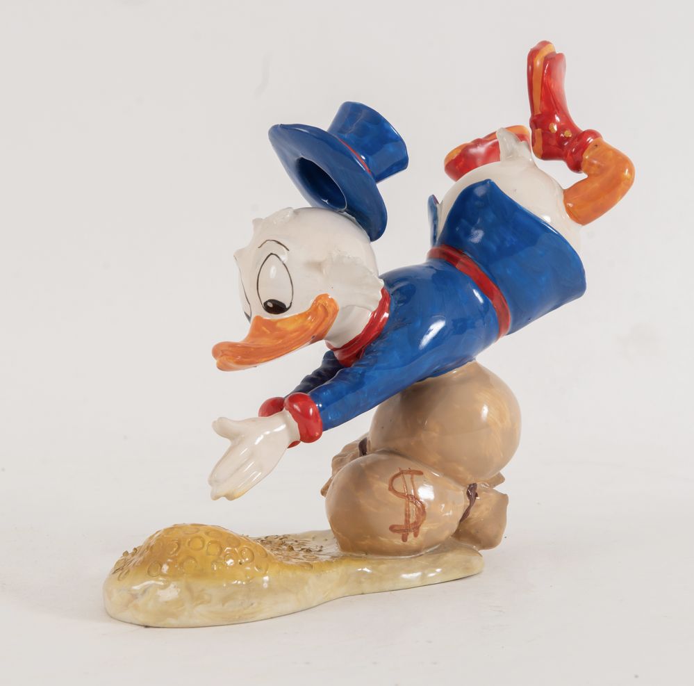 UGO ZACCAGNINI (1868-1937), attr. "Paperone". Scultura in ceramica smaltata. Cm 20x22,5x10. Sotto la base reca sigla e incisione Walt Disney Production.