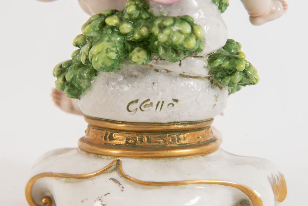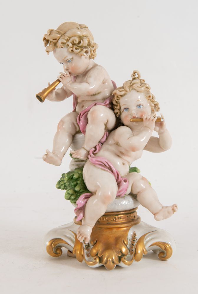 GIUSEPPE CAPPE’ (Cittiglio 1921- Lomagna 2008) "Putti suonatori". Porcellana smaltata firmata al retro Gcappè. Sotto la base in blu reca marchio N coronata. Cm 24x13x11. (difetti)