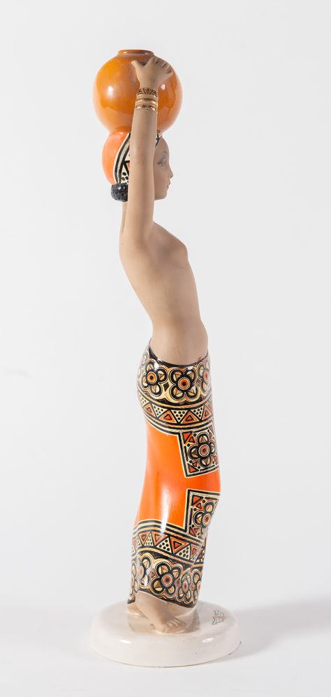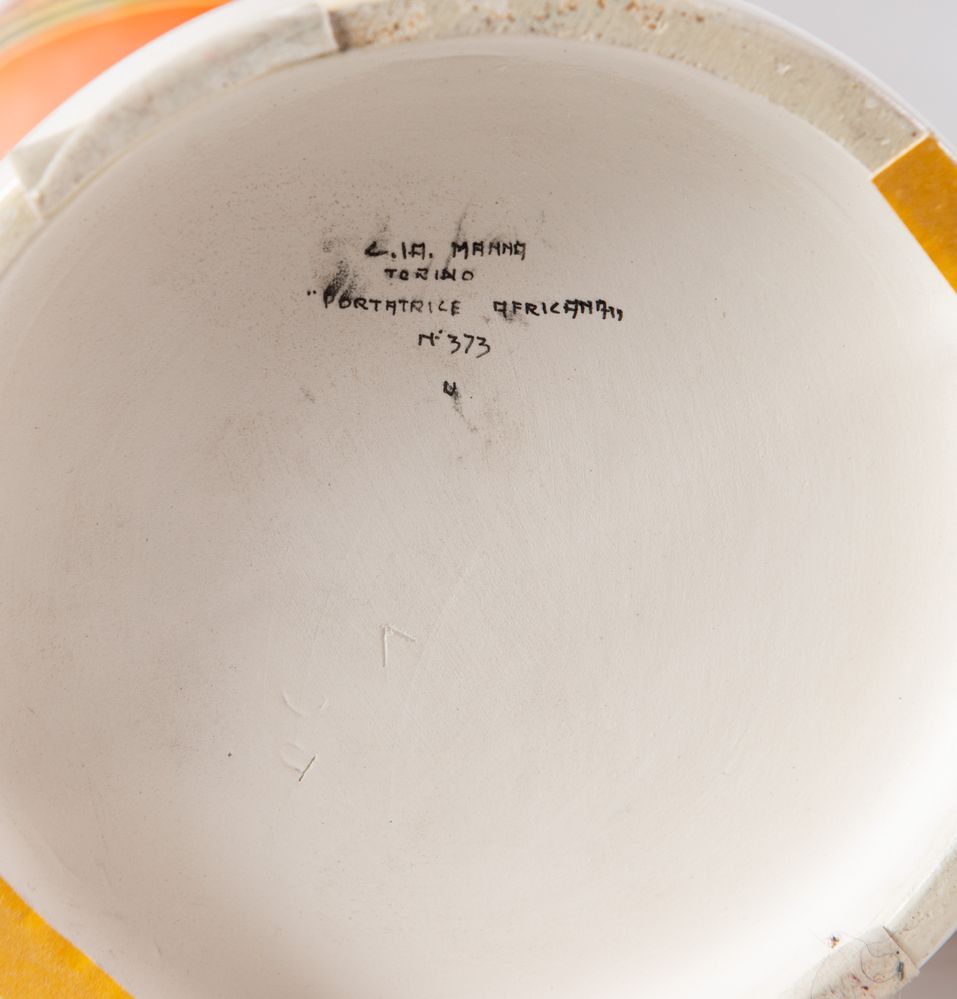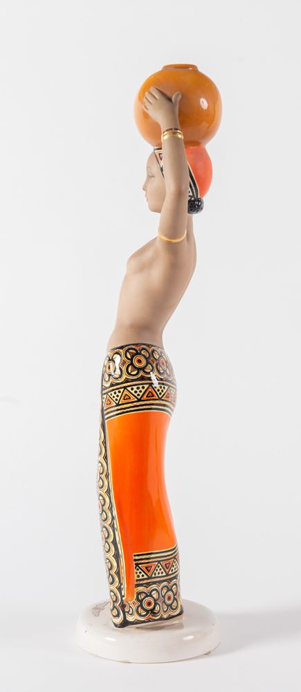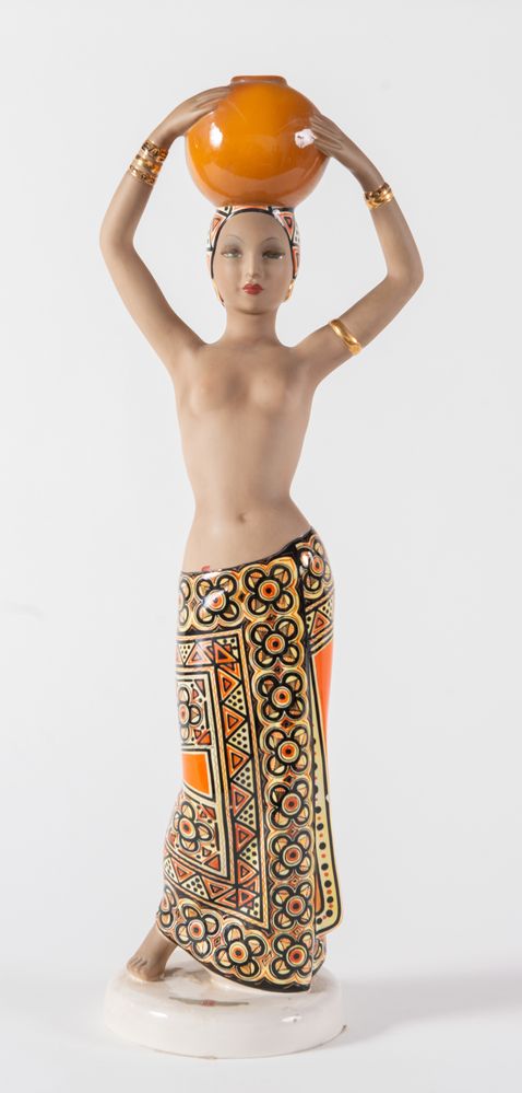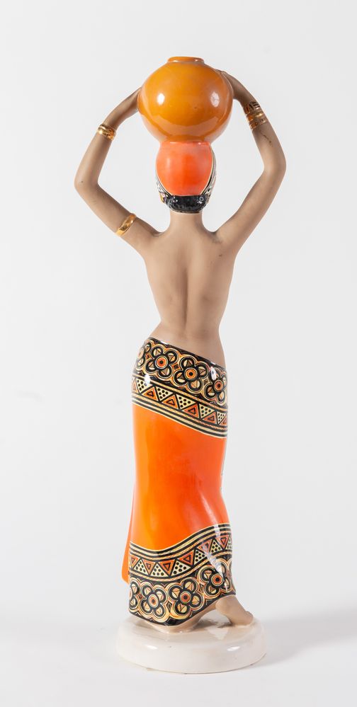 C.I.A. MANNA, Torino 1930/1940 ca. "Portatrice africana". Scultura in ceramica policroma torinese, presenta lumeggiature dorate. Sotto la base reca firma C.I.A. Manna Torino "portattrie africana" n. 373. Cm 55,5xØ base 14.