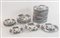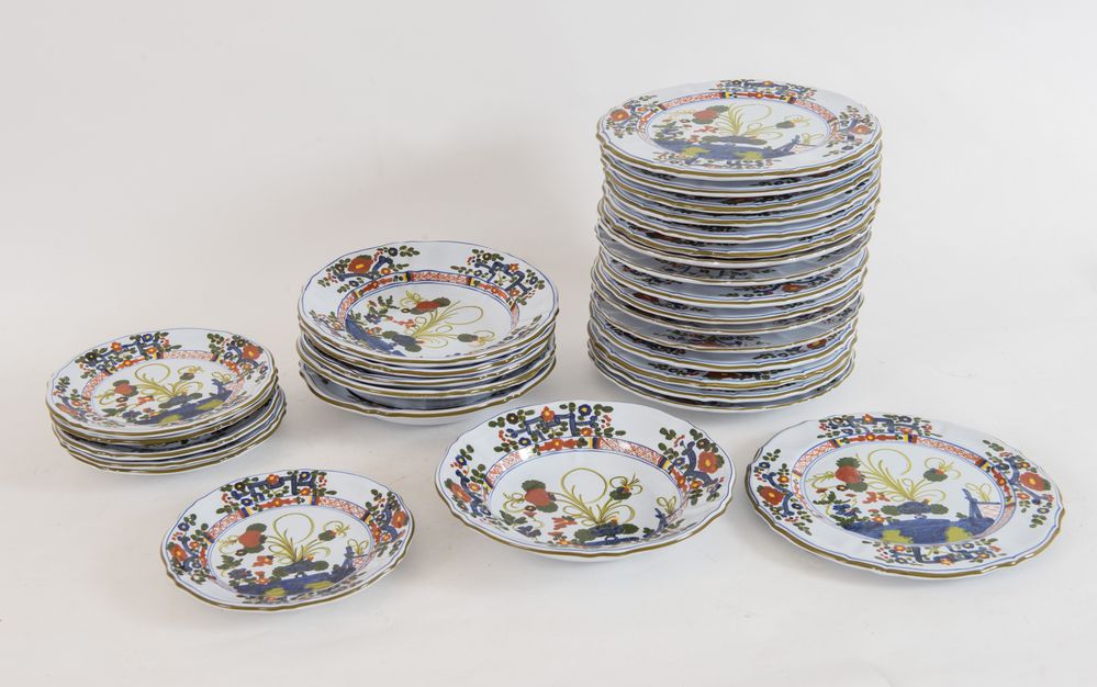 CERAMICA FAENZA PADOVANI, 1985. Lotto composto da diciassette piatti piani, sei fondine e sei piatti da dolce. Piatti rispettivamente in Ø: cm 20; cm 25 e cm 25,5.