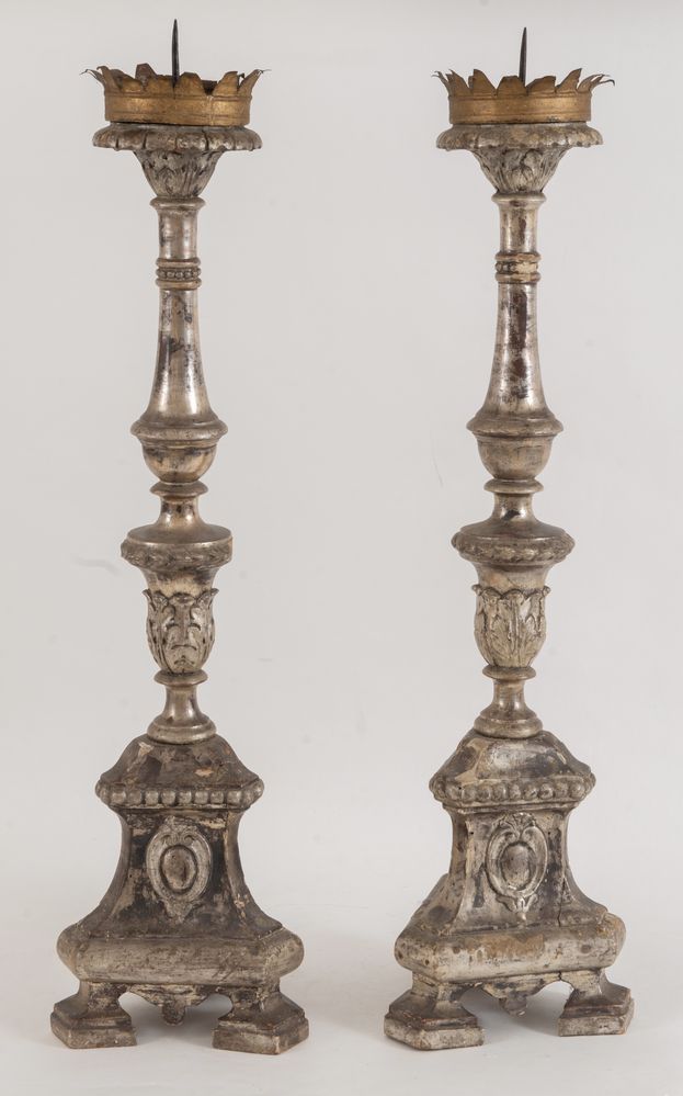 COPPIA DI CANDELABRI in legno intagliato e argentato. Italia, fine del XVIII secolo. Cm 89x22,5x22,5.