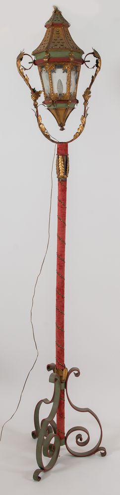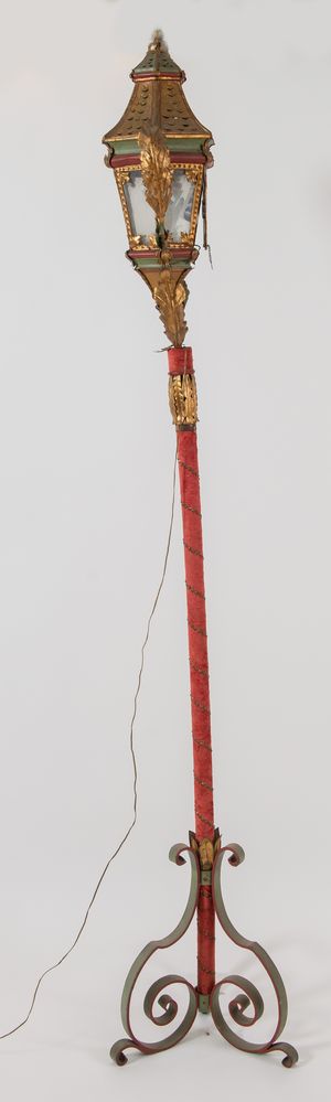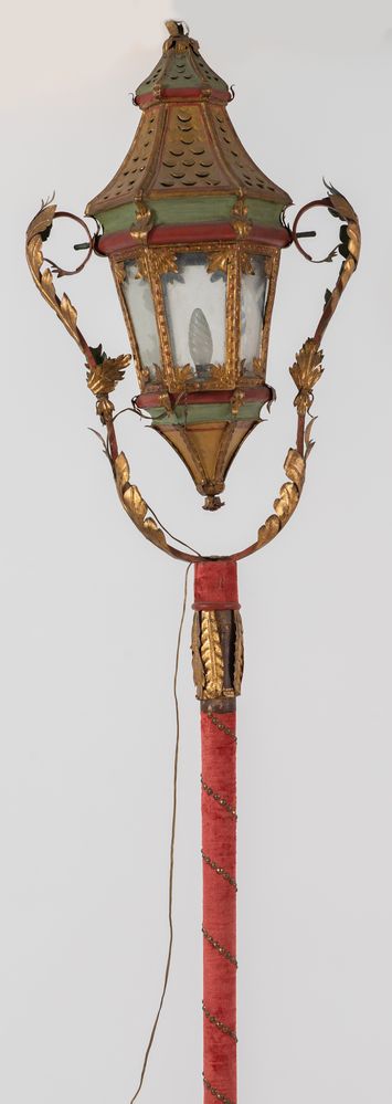 LAMPIONE PROCESSIONALE in lamierino sbalzato e dorato. Inizi del XIX secolo. Cm 220x39.