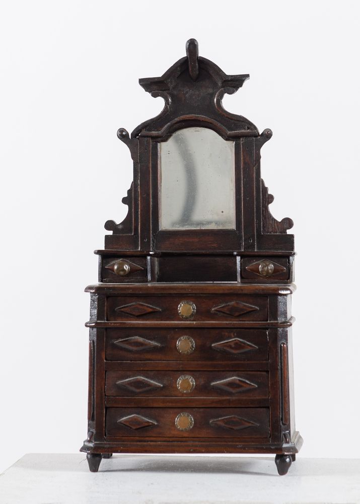 MODELLINO DI CASSETTONE in miniatura con specchiera. Fine XIX secolo. Il fronte reca quattro cassetti e due cassettini sotto la specchiera. Di gusto Luigi Filippo. Cm 44,5x22x11,5.