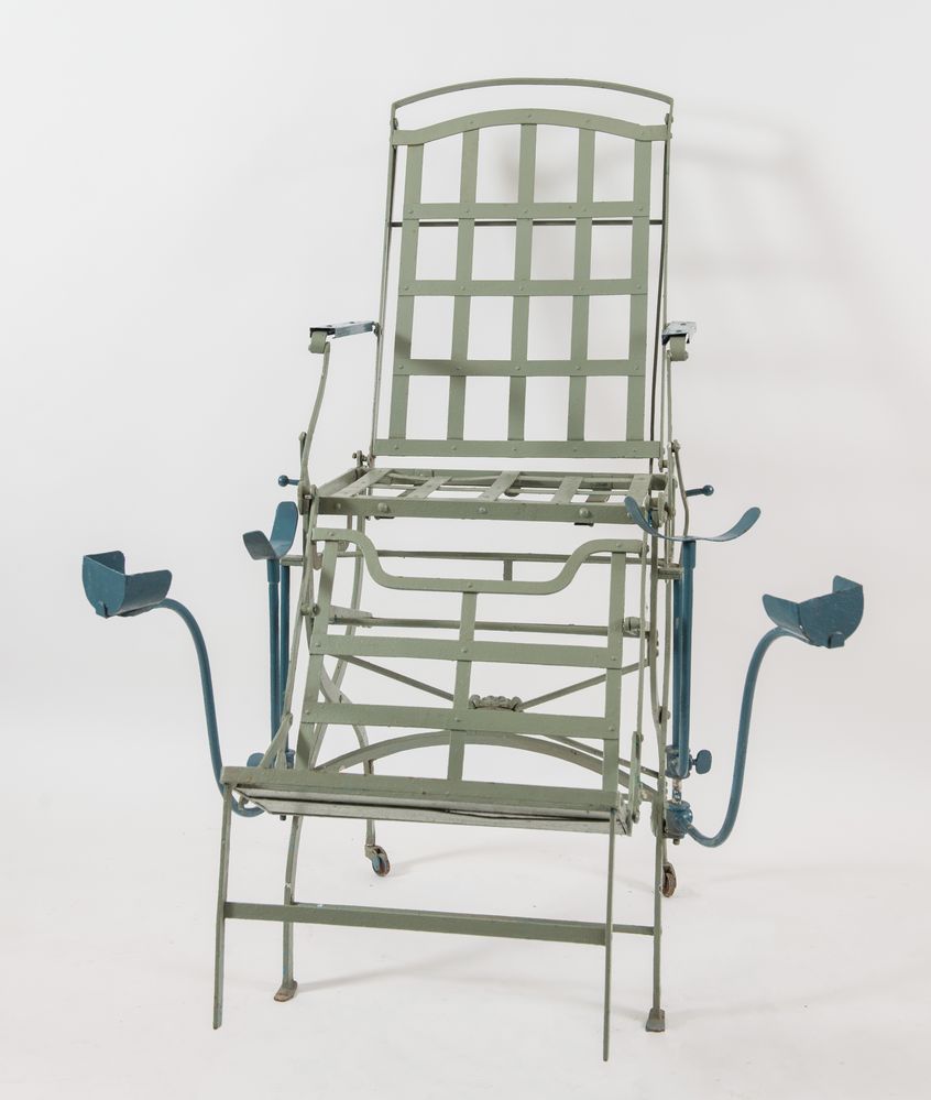 SEDIA DA GINECOLOGO in ferro battuto. Francia/Italia, seconda metà del XIX secolo. Aperta: cm 154x124x78.