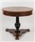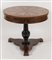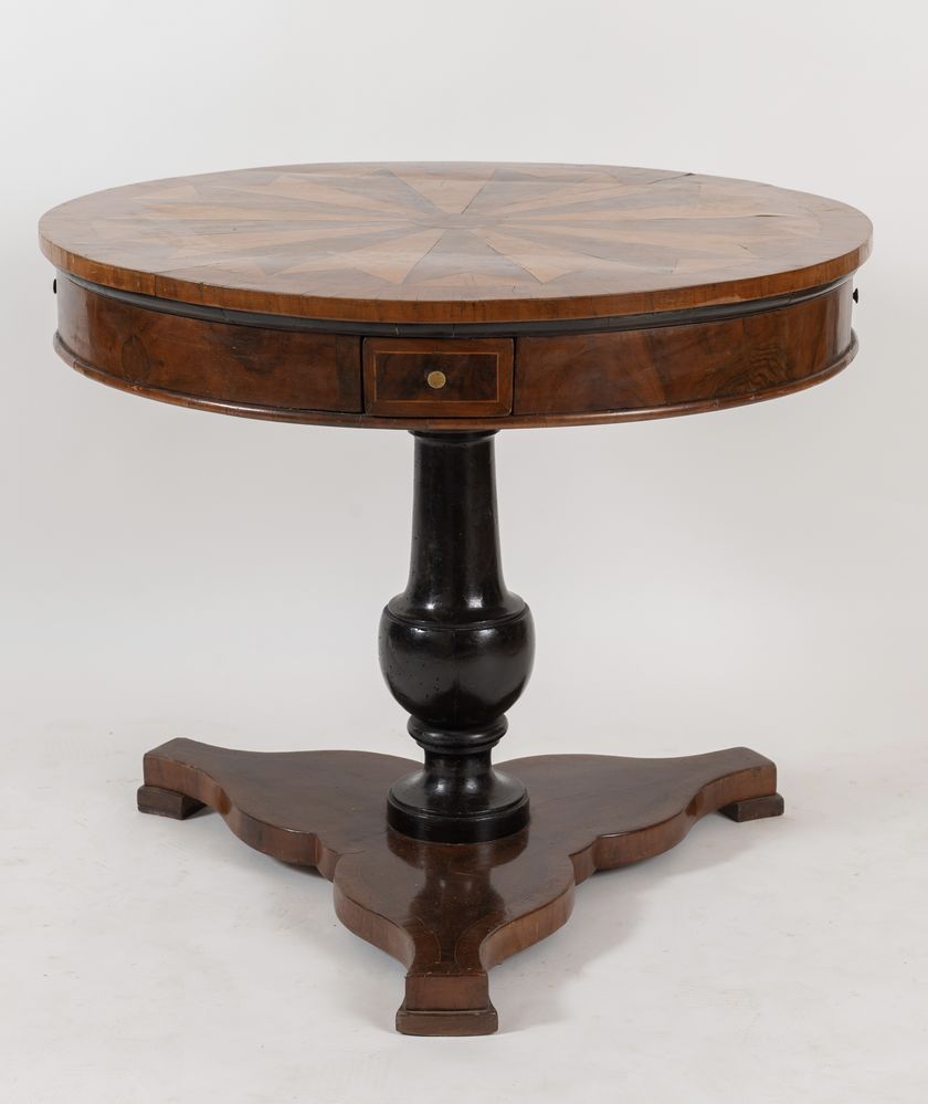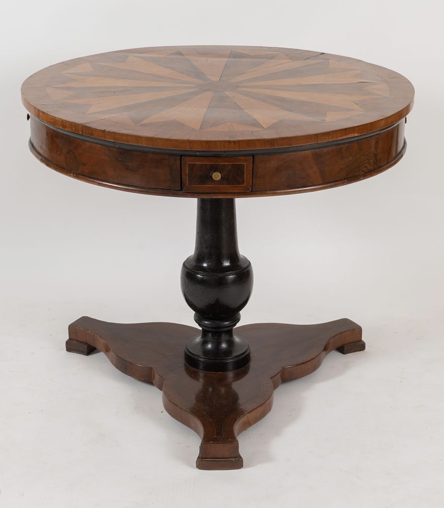 TAVOLO tondo lastricato ed intarsiato a raggiera in noce, ciliegio e acero, con filettature. Recante quattro cassetti in fascia. Sostegno a balaustro ebanizzato, poggiante su pedana lobata lastronata e filettata. Emilia, metà del XIX secolo. Cm 78,5x Ø95.