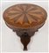 TAVOLO tondo lastricato ed intarsiato a raggiera in noce, ciliegio e acero,...
