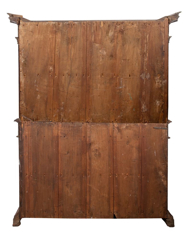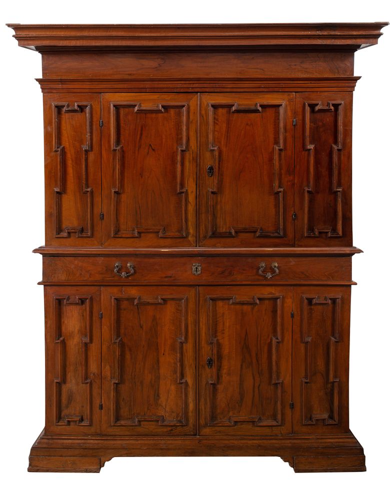 CREDENZA a doppio corpo con due ante alla base, cassetto al centro e due ante laterali. Reca incorniciatura a linea spezzata. Emilia, metà del XVII secolo. Cm 231x183x67. (restauri)
